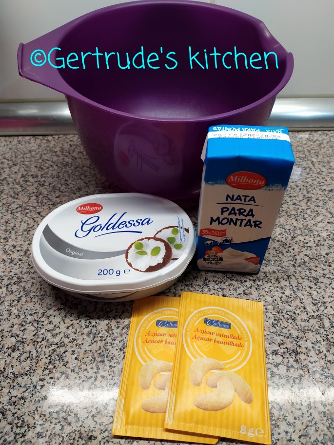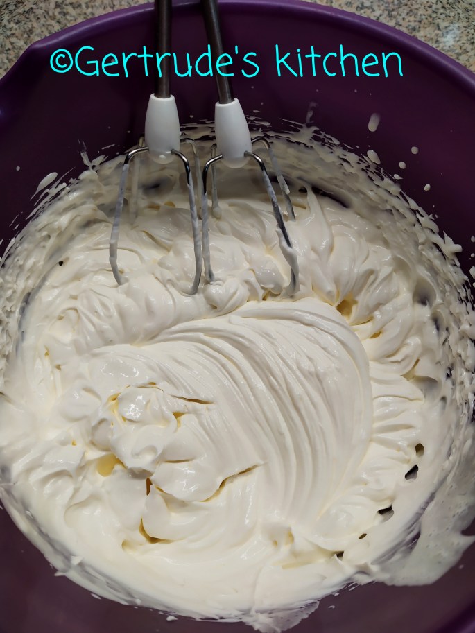 Apoi se pregătește crema. Se mixează brânza cu zahărul laolaltă. După ce jeleul s-a răcit, se poate pune și crema deasupra.