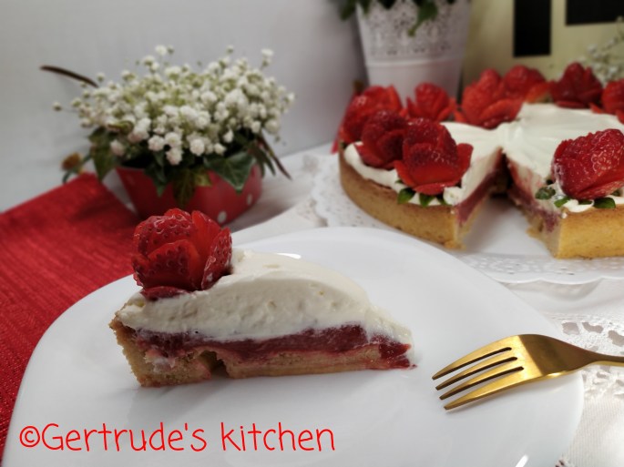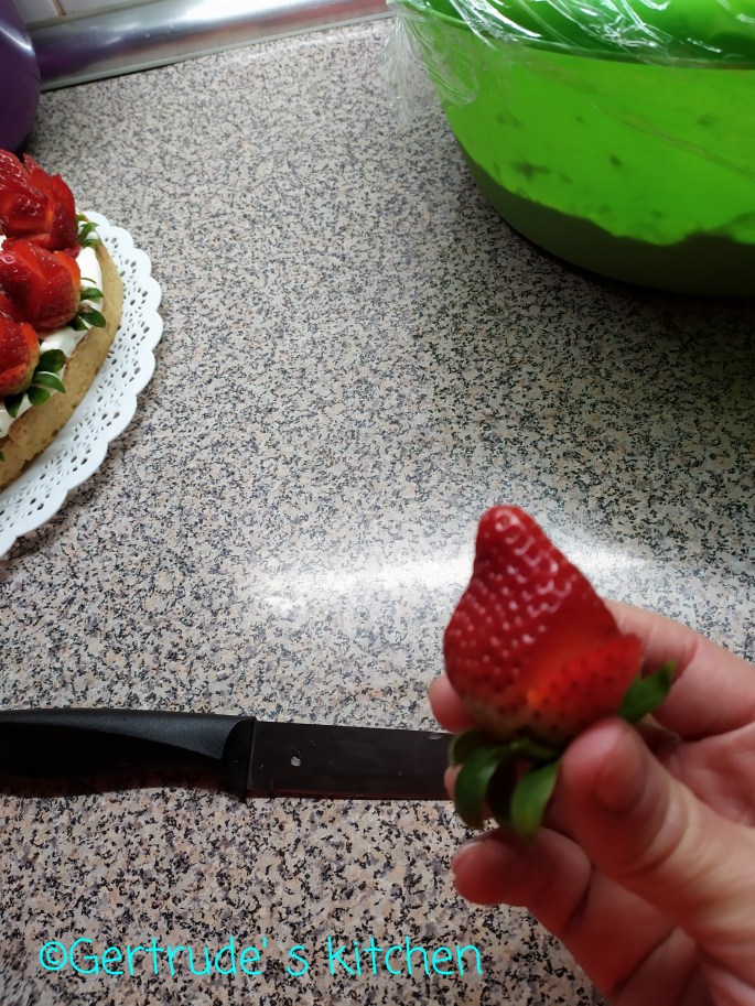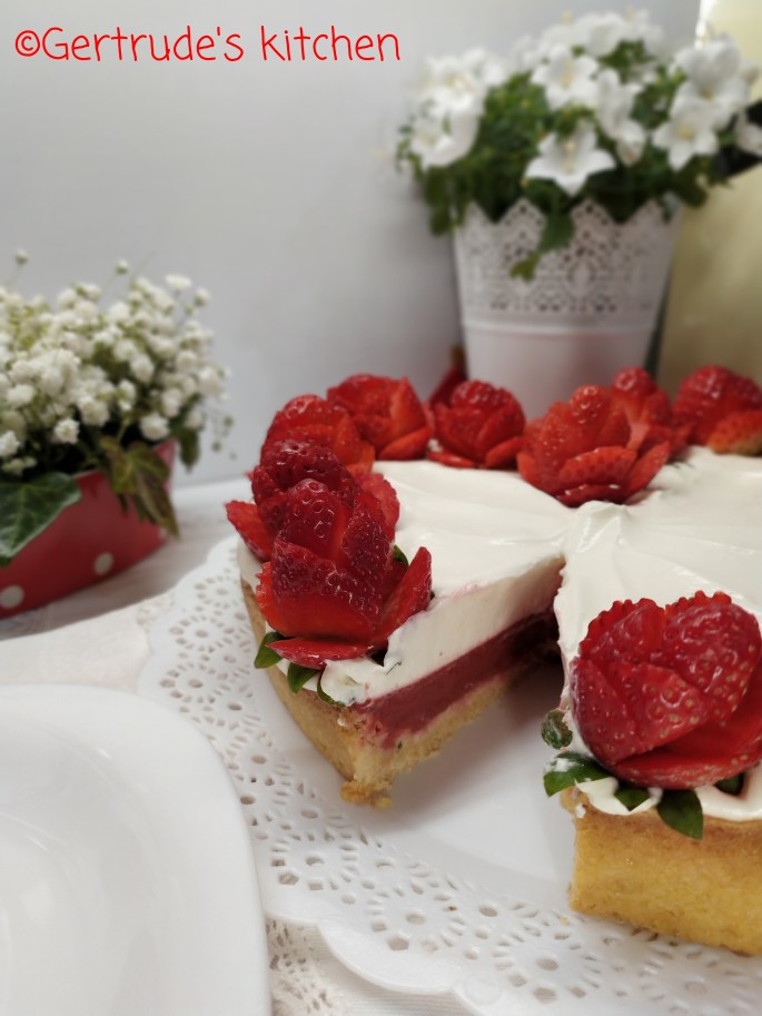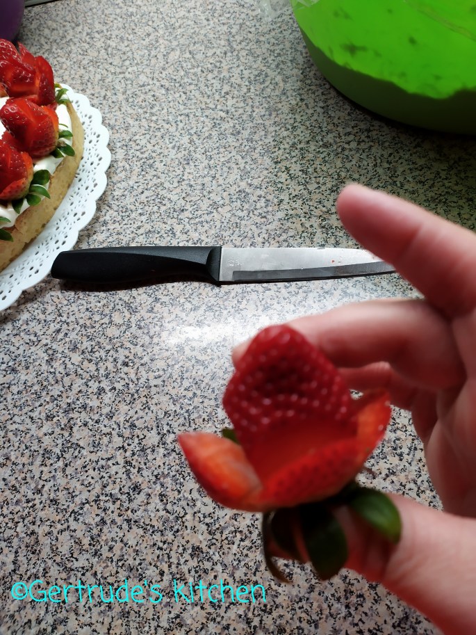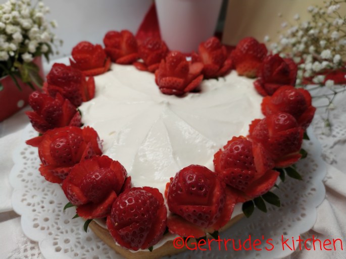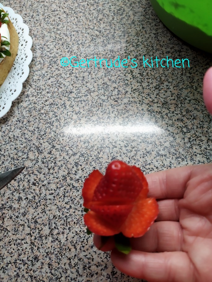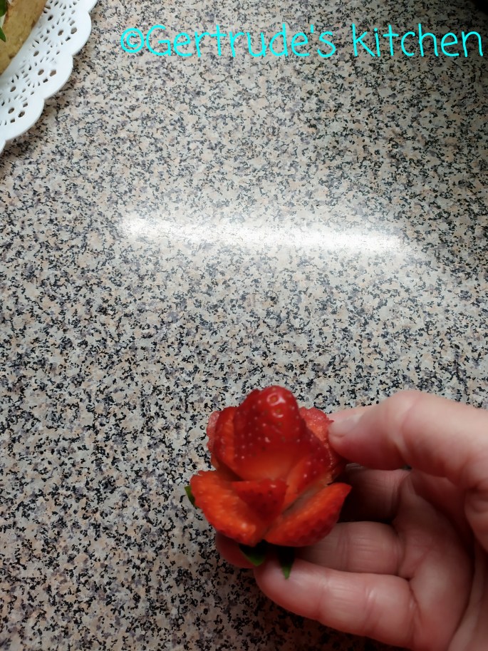Apoi se ornează cu căpșuni tăiate sub formă de trandafiri pe margine.