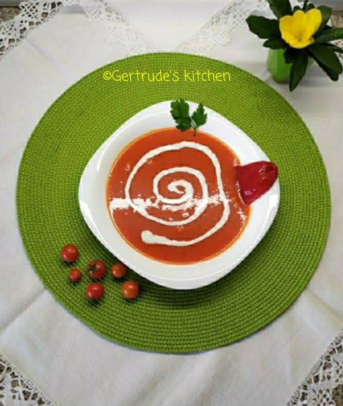 Cartofii, ceapa, usturoiul se pun la fiert cu o cană de apă, din cei 2 l. Când sunt fierte zarzavaturile, se adaugă ardeii copți și curățați se coajă și semințe, sarea, uleiul și oregano și se blendează cu blenderul vertical.Se adaugă și restul de apă și se mai dă un clocot.