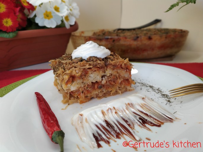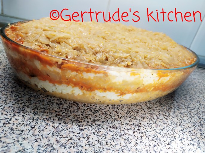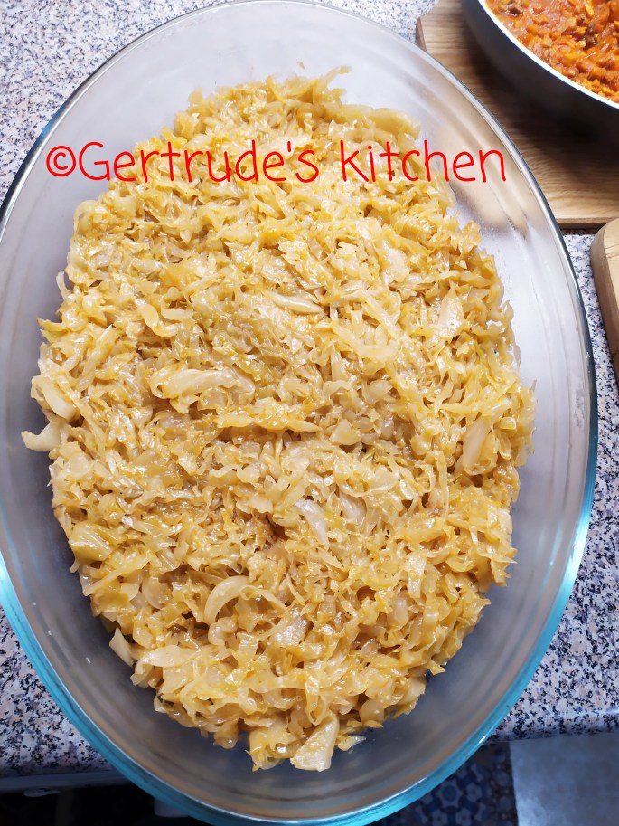 Într-un vas mare de jena se așează prima dată 1/3 din varza călită. Apoi 1/2 din orezul fiert. Și apoi 1/2 din amestecul cu ciuperci. Se pune încă 1/3 din varza călită și apoi alt strat de orez și altul cu ciuperci. Se încheie cu al treilea strat de varză.