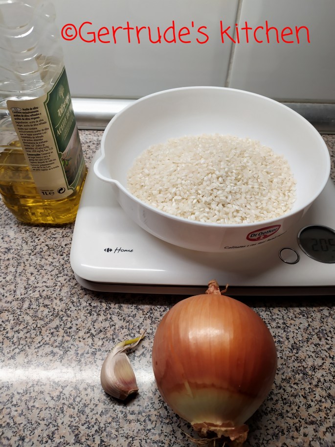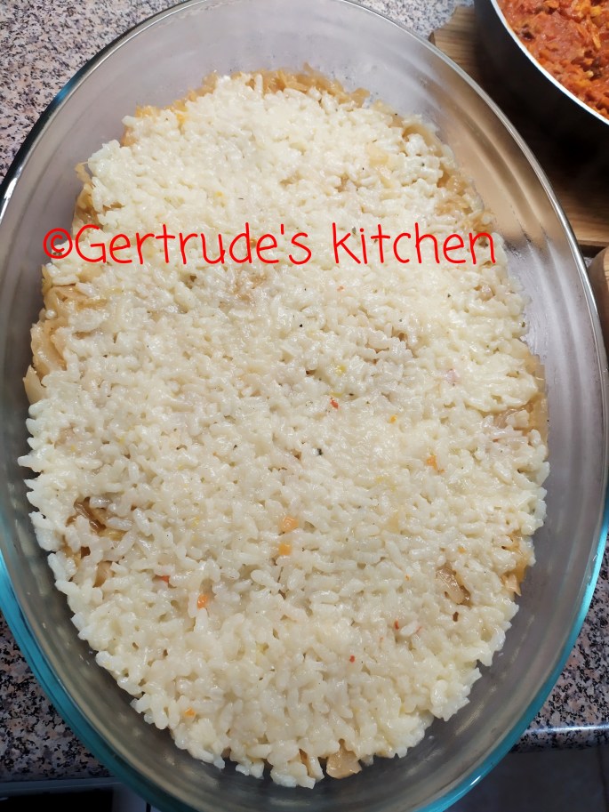 Într-o alta crăticioară se pune o ceapă tocată la călit cu puțină apă și 2 linguri de ulei. Apoi se adaugă 300 ml apă. Când aceasta clocotește, se pune și orezul la fiert. Se adaugă o linguriță de praf de usturoi. Se fierbe 10 minute, apoi se dă deoparte.