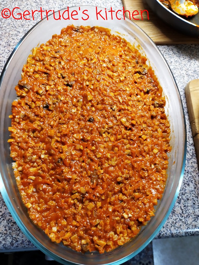 Într-o tigaie încăpătoare se pun la înăbușit cea de-a doua ceapă tocată, morcovii răzuiți și ciupercile tăiate cubulețe mici cu 2 linguri de ulei și puțină apă. Se adaugă și condimentele. Când s-au înmuiat zarzavaturile, se adaugă soia texturată și pasta de roșii. Apoi se ia de pe foc.