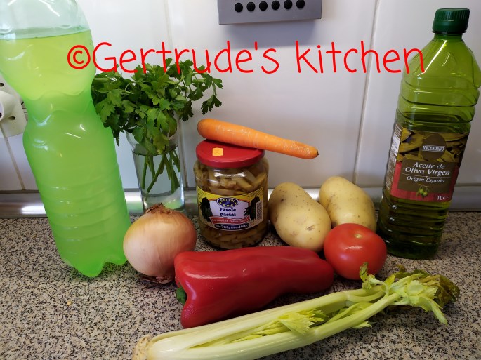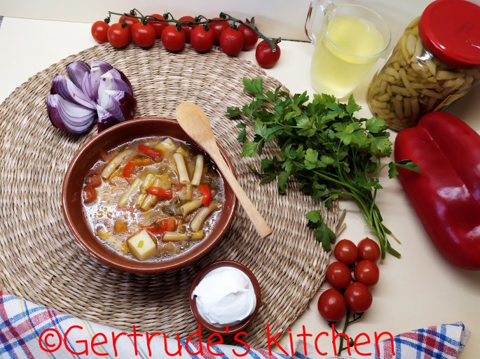 Când toate sunt fierte, se adaugă zerul(lămâie sau bulion de corcodușe) restul de apă încălzită, uleiul și verdeața tocată. (Dacă se folosește fasole conservată, atunci aceasta se adaugă acum, la urmă)