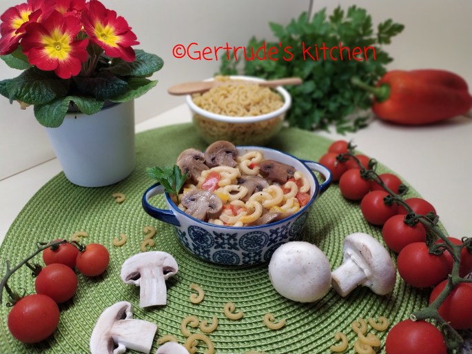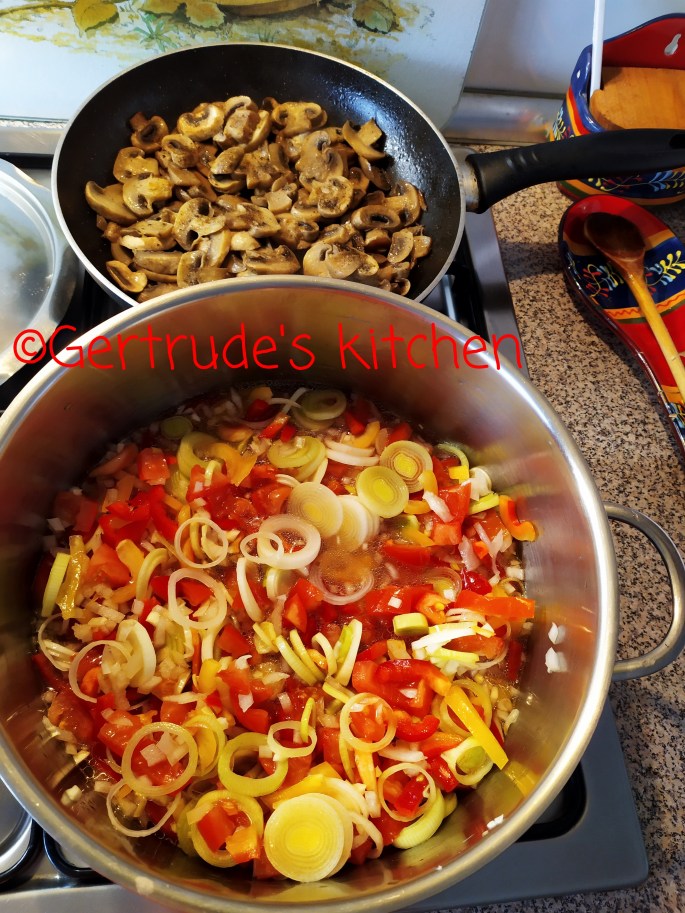 Într-o cratiță se pune ceapa și usturoiul tocate, prazul rondele, ardeiul fâșioare și roșiile cubulețe cu puțină apă și ulei. După ce sunt ușor inmuiate, se adaugă pastele și cam 1 l apă, sau supă de legume. Se lasă să fiarbă la foc potrivit. Se adaugă și condimentele. După ce toate sunt fierte, se adaugă pătrunjel verde tocat și ciupercile călite separat.