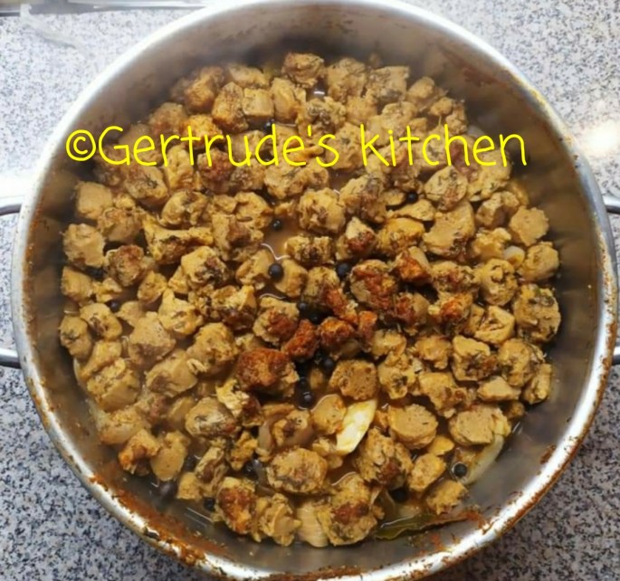 Cuburile de soia se pun la fiert cu apa și condimentele 20 min. Apoi se pun la răcit și la scurs. Se mai pot strânge în mână pentru a stoarce lichidul rămas în cuburile de soia.