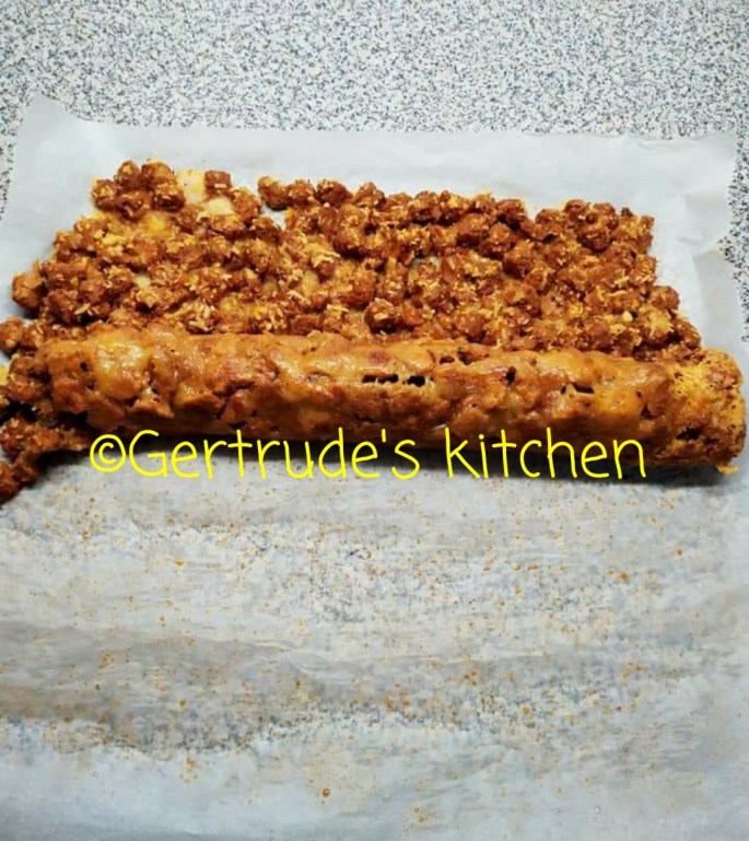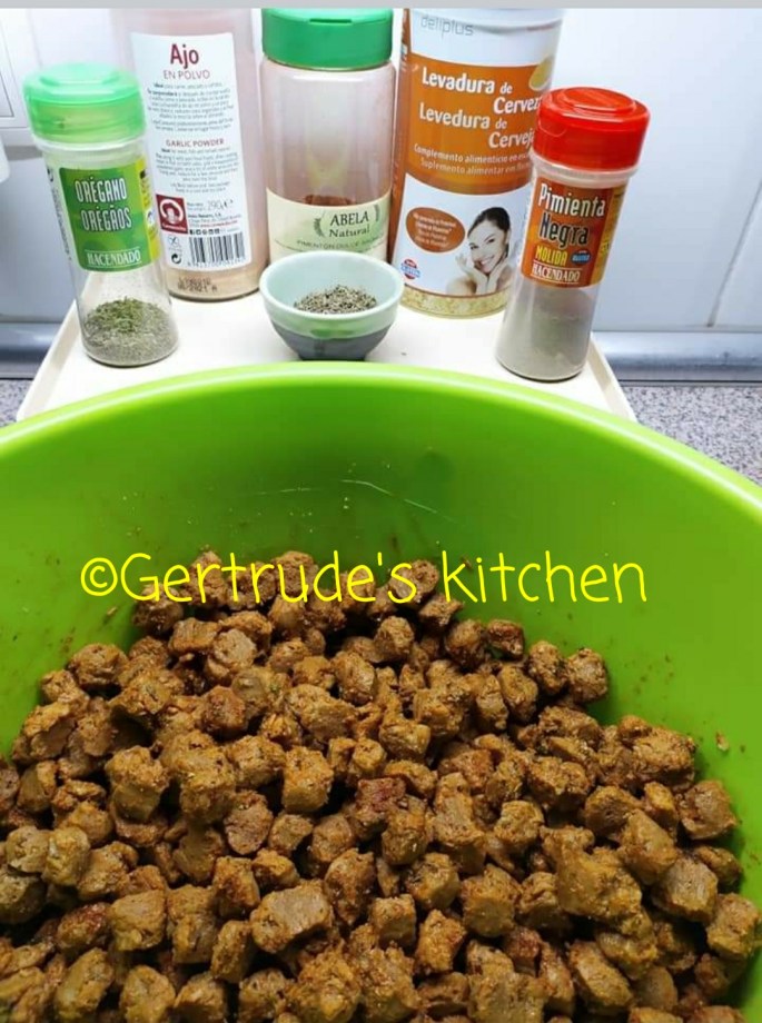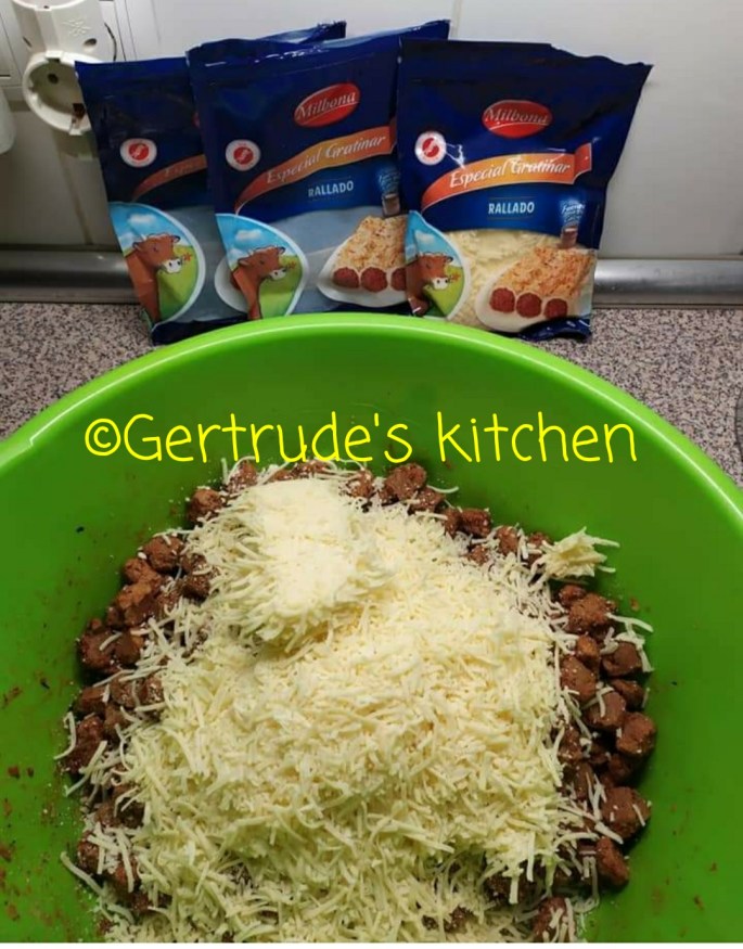 Cuburile de soia se amestecă apoi cu condimentele pentru produsul final. Apoi se adaugă 2/3 cașcaval și se amestecă totul bine.