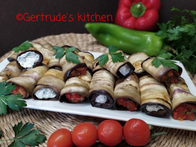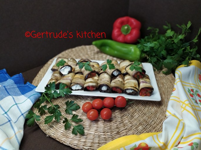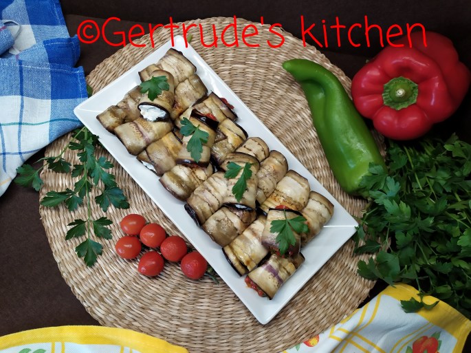 Se ia câte o felie de vinete, se pune puțină umplutură la extremitatea dinspre coadă și se rulează.