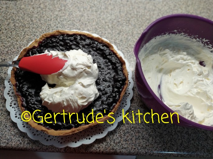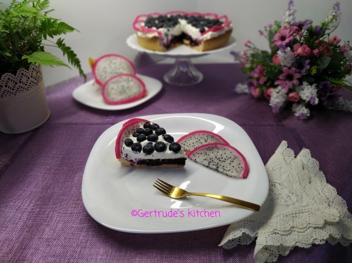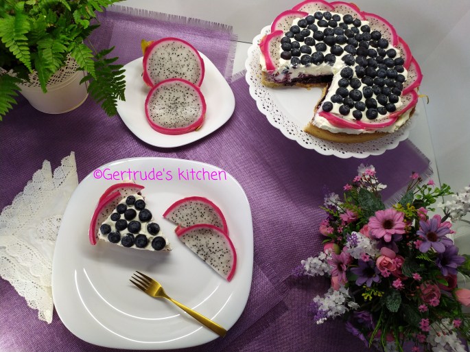 Se mixează frișca lichidă împreună cu zahărul și zahărul vanilat. Aceasta se pune deasupra gelatinei și se ornează cu afine proaspete și jumătăți de felii de pithaya.