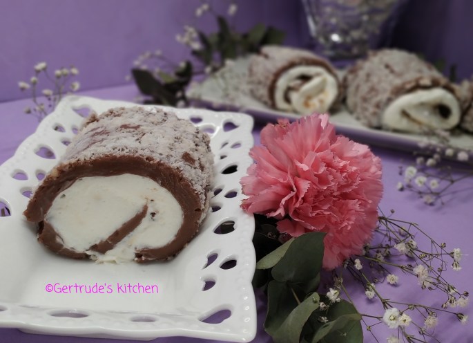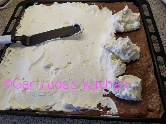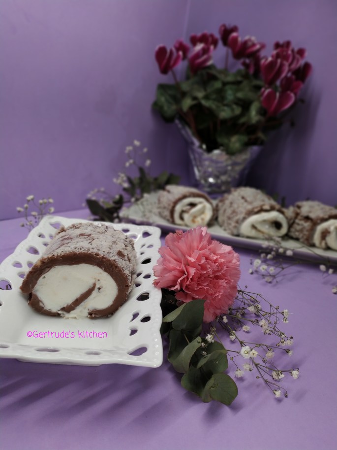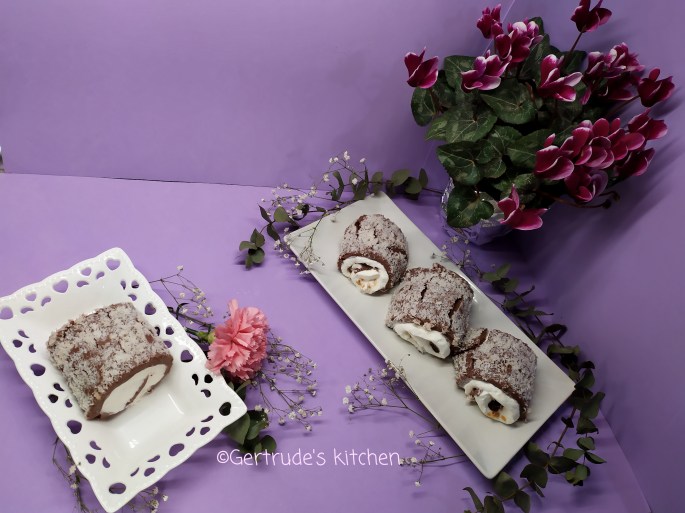 Apoi se desprinde cu cuțitul de pe marginea tăvii, se taie pe mijloc de-a lungul tăvii. Apoi se taie de-a latul tăvi în bucăți de 3cm lățime. Apoi se rulează dinspre marginea tăvii spre mijloc, cu foarte mare grijă. Fiecare rulou se așează pe o tavă. Apoi se păstrează la frigider până la servire.