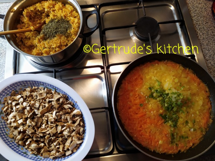 Orezul se pune la fiert cu 300 ml apă și puțină sare. Când acesta este aproape fiert, se adaugă și granulele de soia.