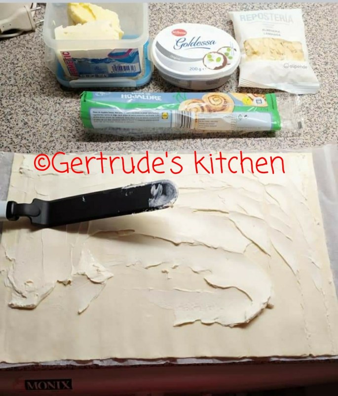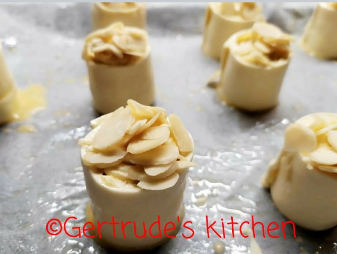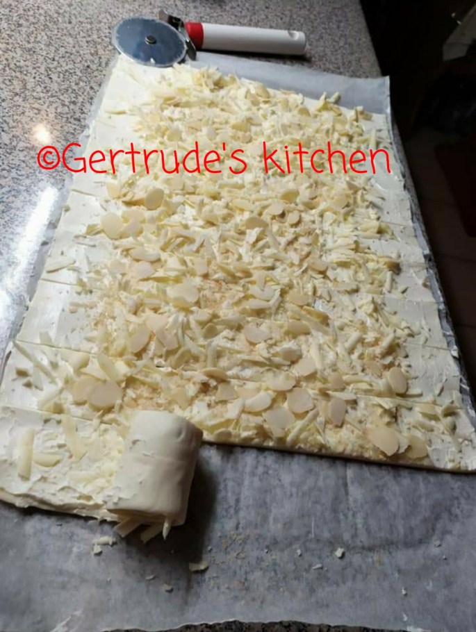 Se porționează tăind pe lățimea aluatului fâșii de cca 3 cm. Mie mi-au ieșit 10 bucăți. Se rulează și se pun în picioare pe o tavă cu hârtie de copt. Se ung cu ou bătut deasupra și pe laterale și se presară cu fulgi de migdale.