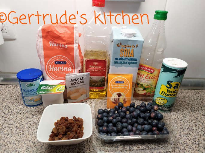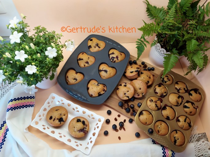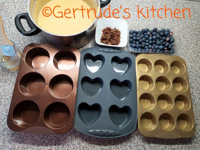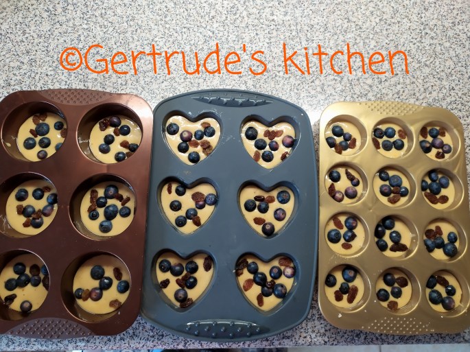 Se toarnă compoziția în forme doar 3/4 din capacitatea acestora. Se pun afinele și stafidele și se pun la copt la cuptor la 200 grade Celsius 12-15 minute.