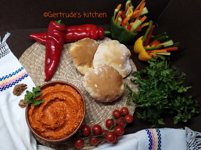 Se servește cu lipii libaneze numite pita și cu bastonașe de legume:ardei, castraveți, morcovi.