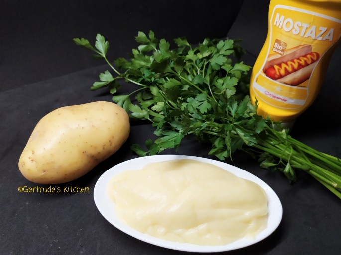 Se fierbe cartoful cu coajă. Apoi se lasă la răcit. Se taie sau se zdrobește, se pune în vasul blenderului vertical și se blendează împreună cu celelalte ingrediente. Va emulsiona foarte repede.