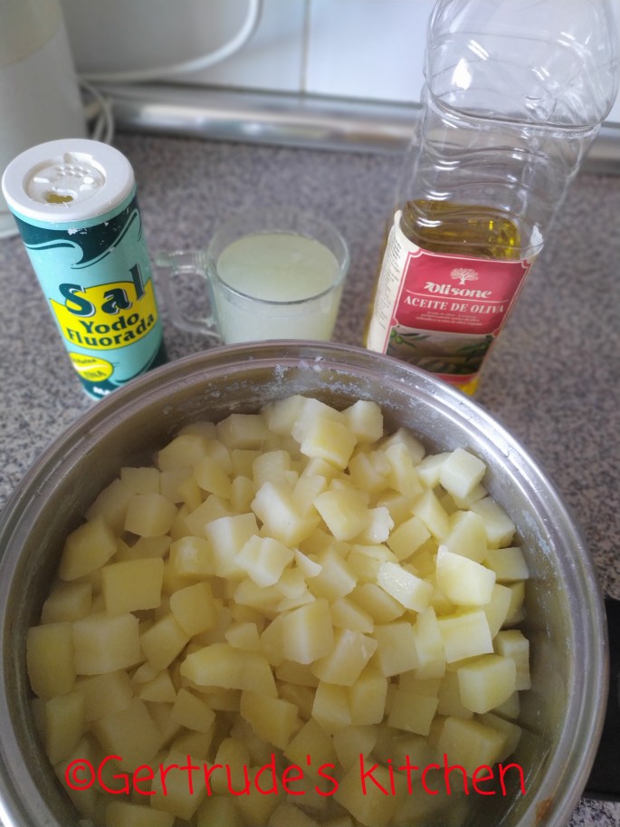 Se curăță cartofii și se taie cubulețe de aceeași dimensiune. Se pun la fiert în apă cu sare. Apa nu trebuie sa depășească nivelul cartofilor în cratiță.