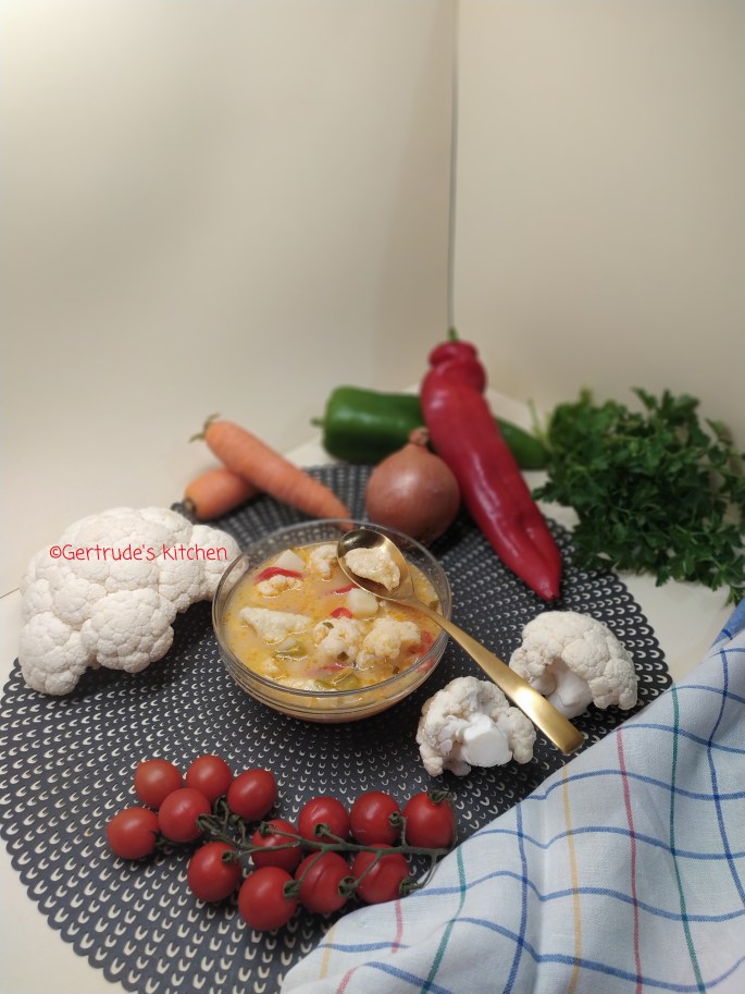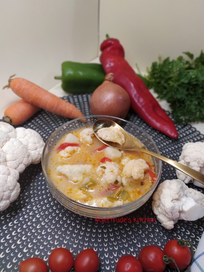 Conopida se desface în buchețele mici iar cartofi se taie cuburi. Când celelalte zarzavaturi sunt de jumătate fierte, se adaugă și conopida, și cartofii. Se completează supa cu 4-5 litri apă caldă.