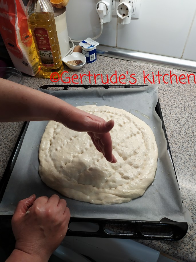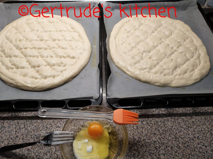 Apoi se pregătesc două tăvi cu hârtie de copt unsă cu ulei. Se împarte aluatul în două și fiecare se întinde cu mâinile unse cu ulei, în formă rotundă sau ovală. Apoi, cu cele patru degete Unite, se marchează o bordură apăsând aluatul. De asemeni se fac linii paralele și apoi altele perpendiculare pe aceste, astfel încât să creeze un model în romburi.