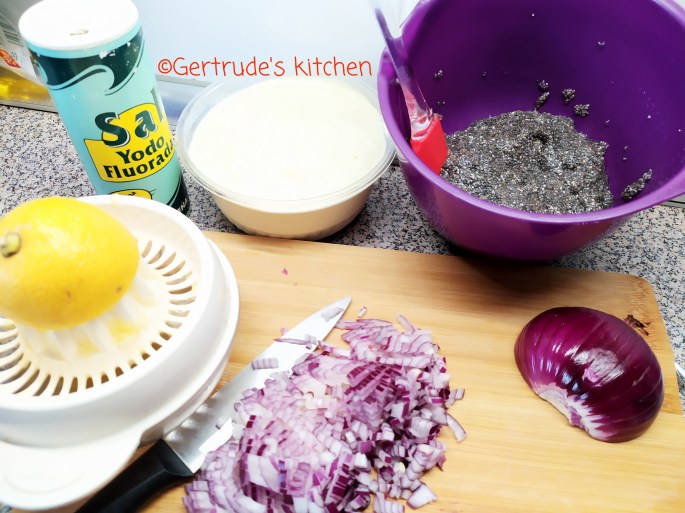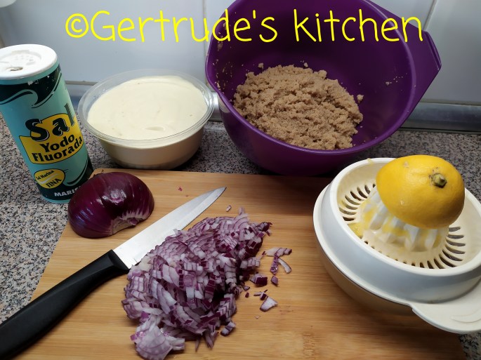 Se amestecă cu maioneza și ceapă tocată mărunt. Se adaugă sucul de lămâie și sare după gust.
