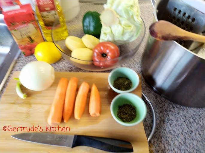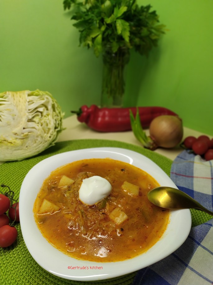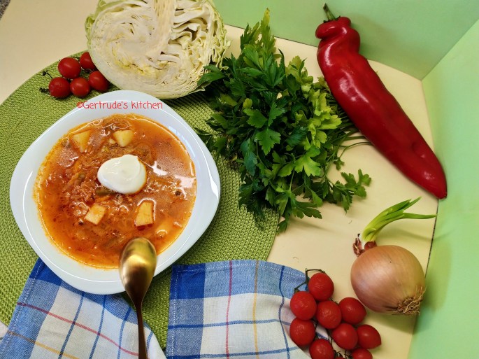 Se toacă ceapa, morcovii se taie rondele sau se rad pe răzătoarea mare, ardeii se taie șuvițe sau cubulețe, roșia se taie mărunt și se adaugă varza tăiată cuburi sau fideluță.