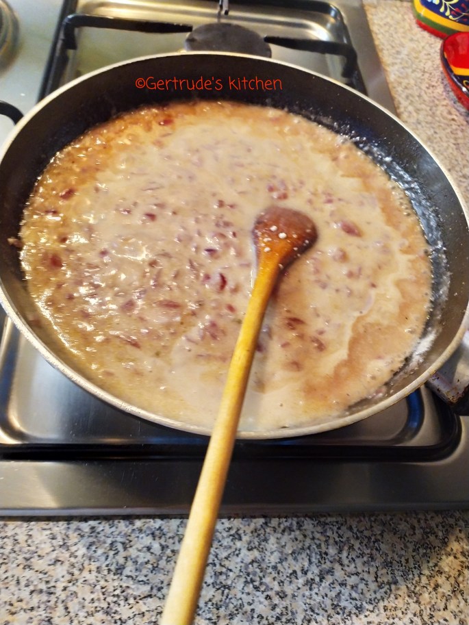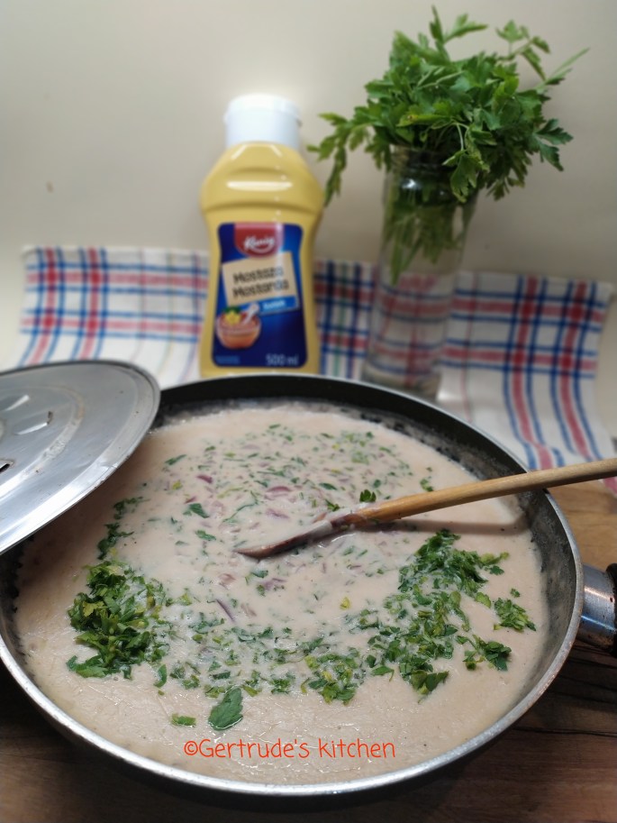 Se toacă ceapa și se pune la înăbușit cu puțină apă și ulei. Când a scăzut apa și s-a înmuiat, se adaugă muștarul, condimentele, făina frecată cu laptele și smântâna. Se lasă să fiarbă ca să se îngroașe sosul.