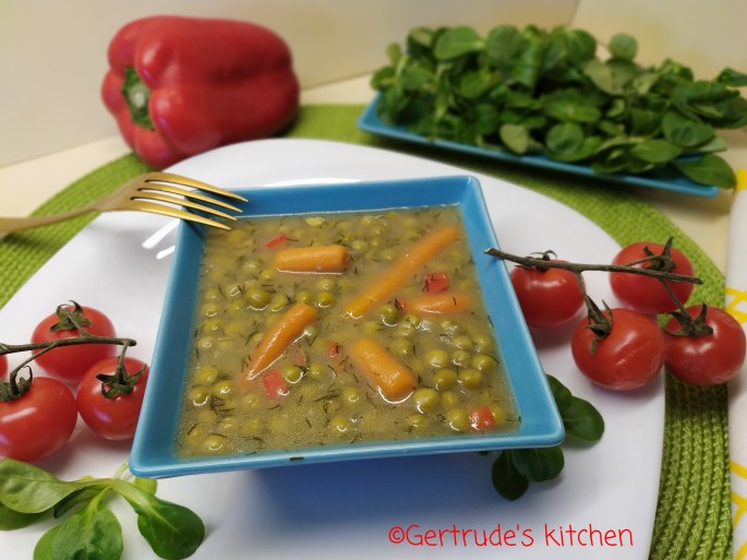 Când e de jumătate fiartă ceapa, se adaugă mazărea crudă și morcovii și apă cât să o acopere și se fierbe.
