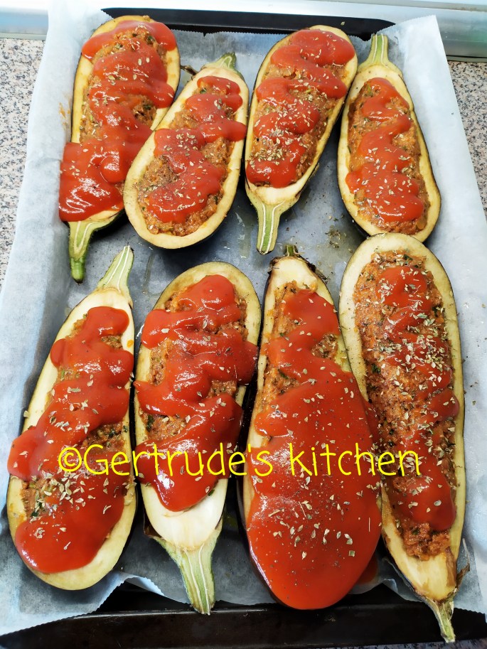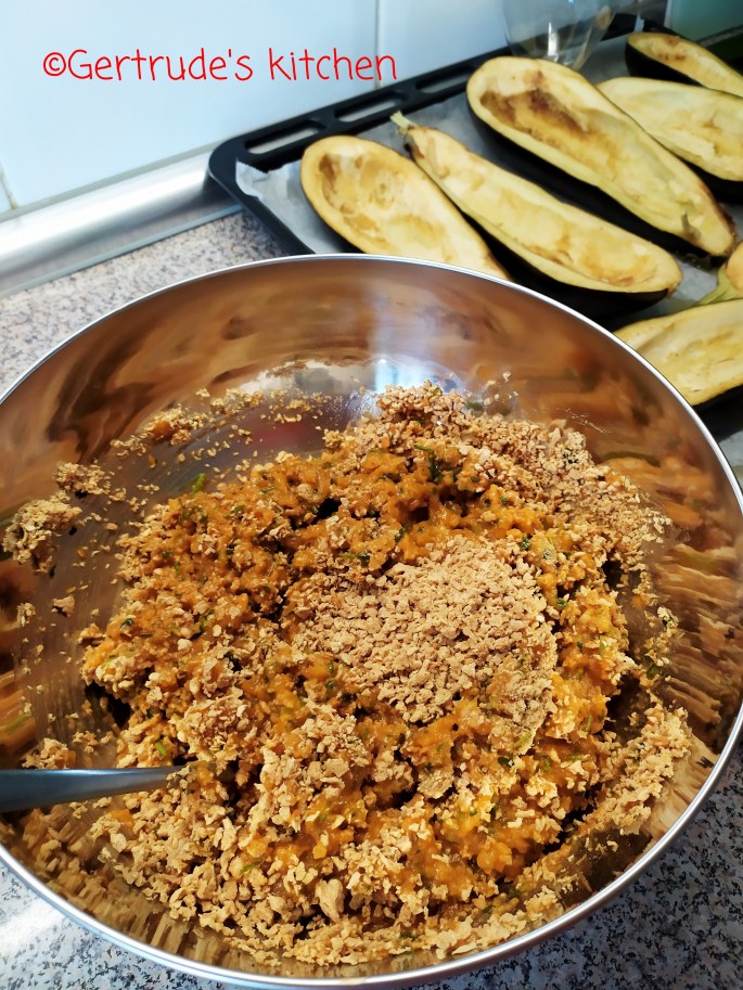 Tocătura rezultată se amestecă și cu restul ingredientelor. Apoi se pune cu o linguriță in bărcuțele de vinete.