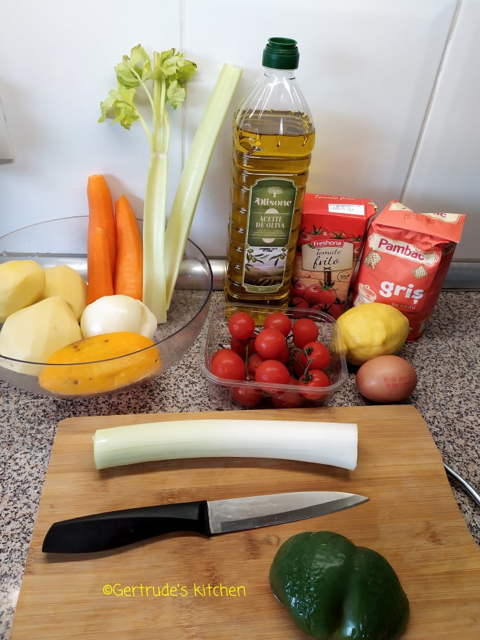 Se toacă mărunt ceapa și prazul. Ardeiul, morcovii și țelina se taie în cubulețe și se pun la fiert toate cu 1 litru de apă.