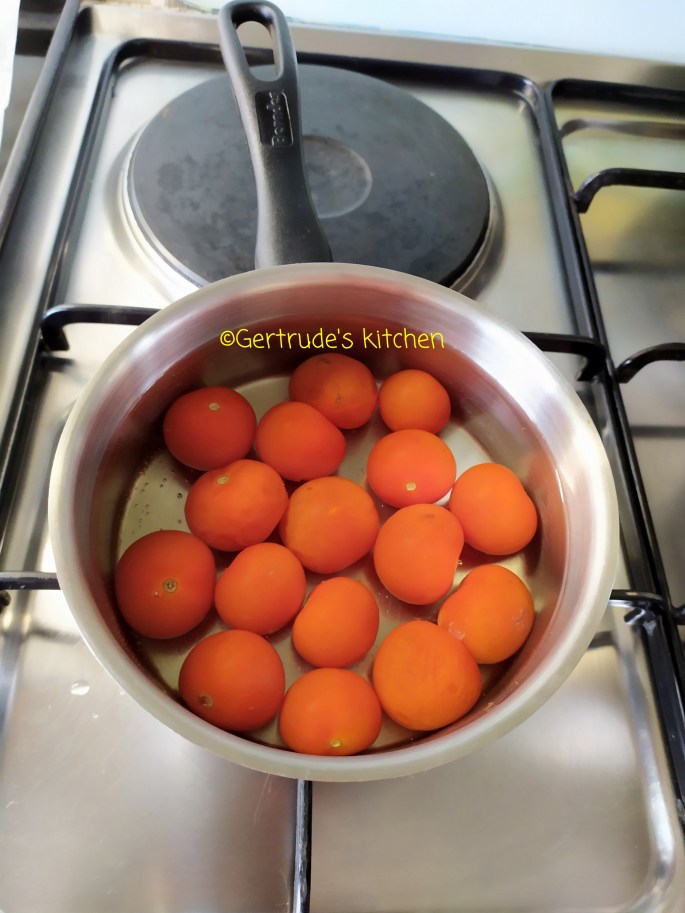 Roșiile cherry se crestează în cruce în dreptul cotorului și se pun la opărit câteva minute cu apă clocotită. Apoi se scurge apa și se lasă la răcit. După aceea se curăță de pieliță – coajă și se lasă deoparte.
