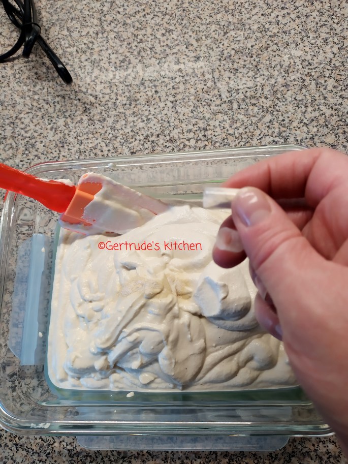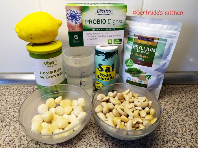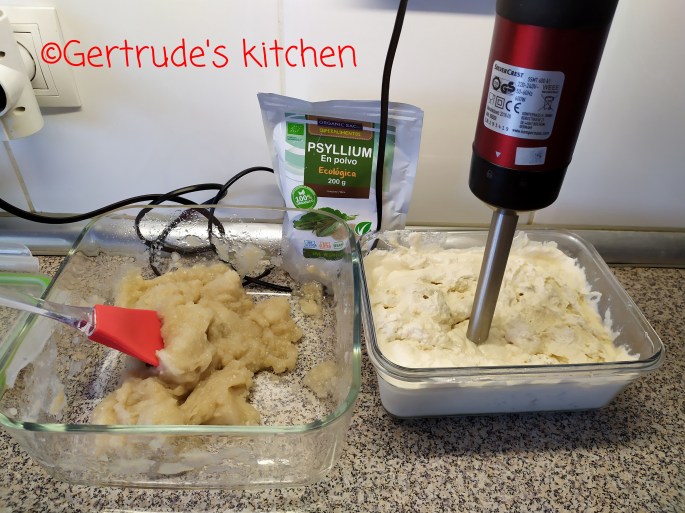 A doua zi se amestecă praful de psyllium (care e din cereale) cu 550ml de apă, amestecând continuu ca să se dizolve fără cocoloașe. Se lasă 3 minute ca să se îngroașe, devenind ca o gelatină. Aceasta se amestecă apoi cu masa de nuci fermentată cu ajutorul unui blender vertical. (Dacă aveți un blender cu cană superpotent, puteți sa va ajutați de acesta).