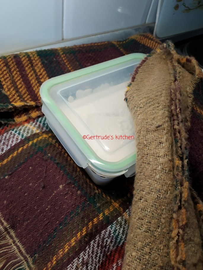 Amestecul se pune într-un vas de sticlă cu capac, învelit într-o păturică și se lasă la fermentat 24 de ore la temperatura camerei.