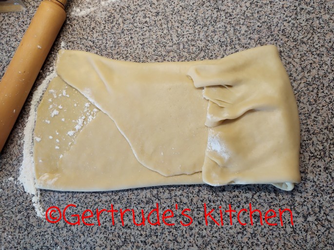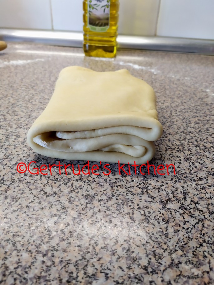 Se întinde aluatul (eu îl impart în 2 pentru că e mai ușor ) și se unge cu ulei, după care se presară cu făină. Se împătură în patru ca la aluatul fraged, și se lasă la odihnit 30 minute în frigider. (partea de sus se împătură peste aluat până la mijloc. La fel se procedează și cu partea de jos. Se face aceeași procedură dinspre stânga spre mijloc, și dinspre dreapta spre mijloc. Apoi în două)