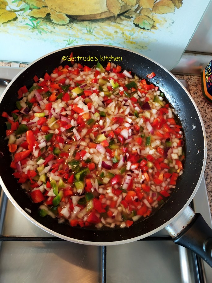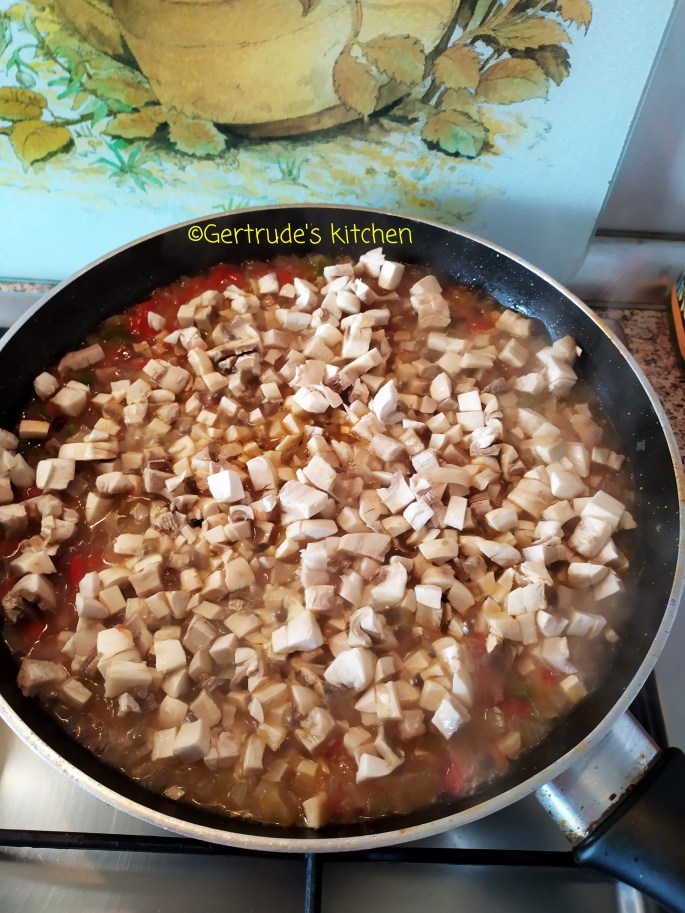 Se taie ceapa și ardeiul cubulețe mici și se pun la fiert cu 3 lg ulei si 200 ml apă. După ce acestea sunt fierte de jumătate, se adaugă și ciupercile tăiate cubulețe. La urmă sosul de roșii, carnea vegetală și condimentele.