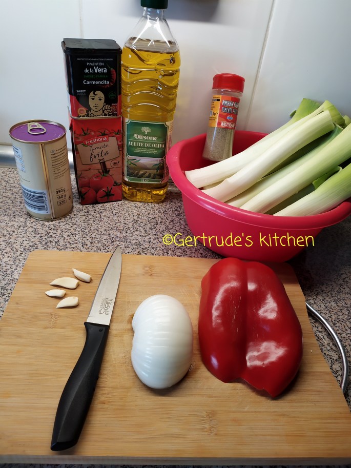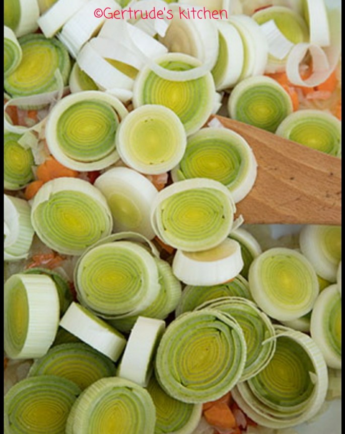Când sunt de jumătate fierte se adaugă prazul tăiat rondele de 1 cm grosime și apă cât să fie sub nivelul legumelor din cratiță.