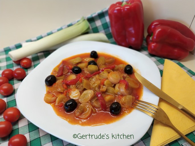 După ce s-a fiert și prazul, se adaugă sosul de roșii, măslinele și pătrunjelul verde tocat. Se mai fierbe 2-3 minute.