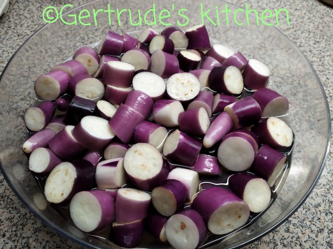 Vinetele se spală, se taie în rondele de 3 cm grosime și se pun într-un castron cu apă și sare 15 minute, ca să iasă amărăciunea din ele.