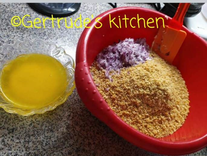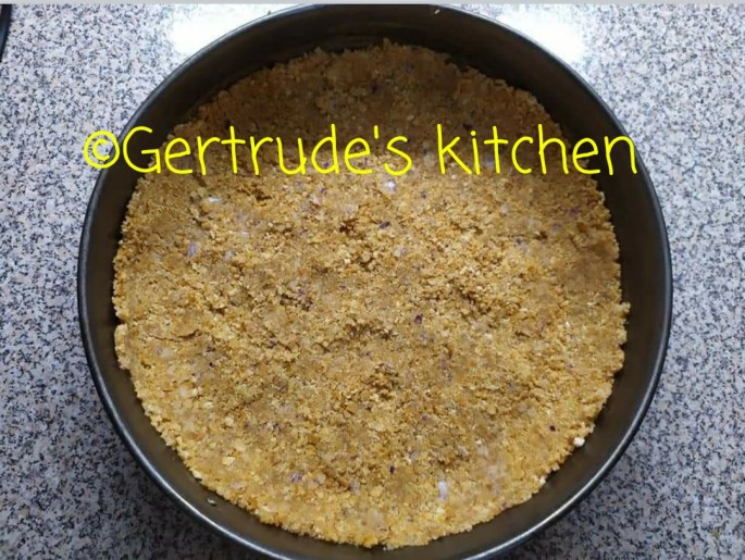 Se blendează biscuiți, pâinea uscată și ceapa și se amestecă cu untul topit. Masa formată se pune într-o formă rotundă cu inel detașabil de 24 cm diametru, pregătită cu hârtie de copt.