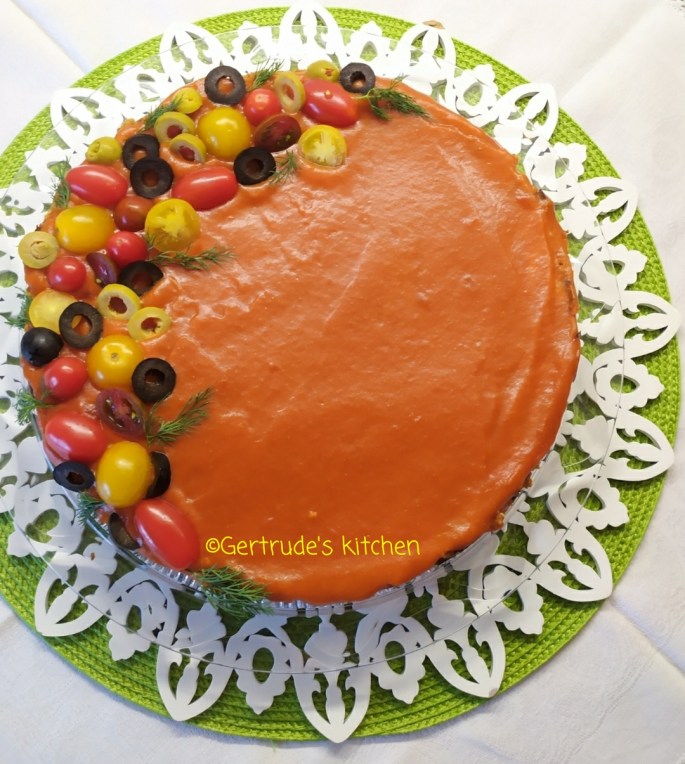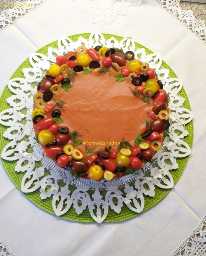 Se decorează cu roșii, măsline și verdeață .
