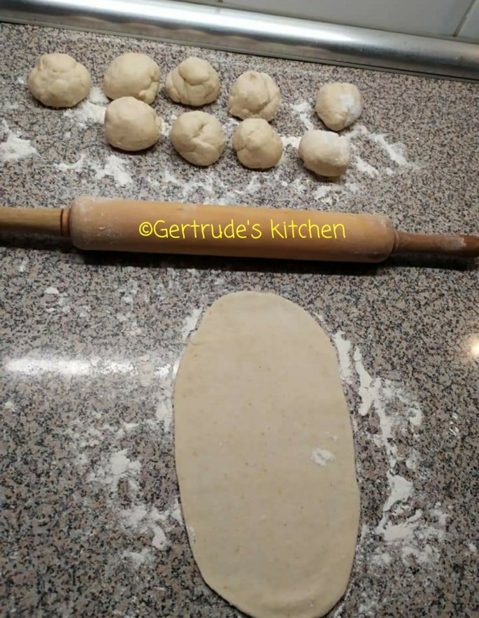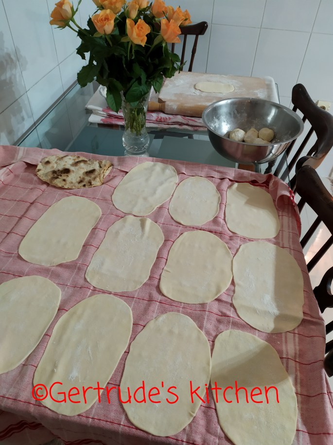 Se împarte aluatul cam în 8-9 bile egale. Se întinde pe rând câte una sub formă ovală pe masa presărată cu făină , și se coace pe ambele părți într-o tigaie antiaderentă neunsă cu ulei sau alt fel de grasime.
