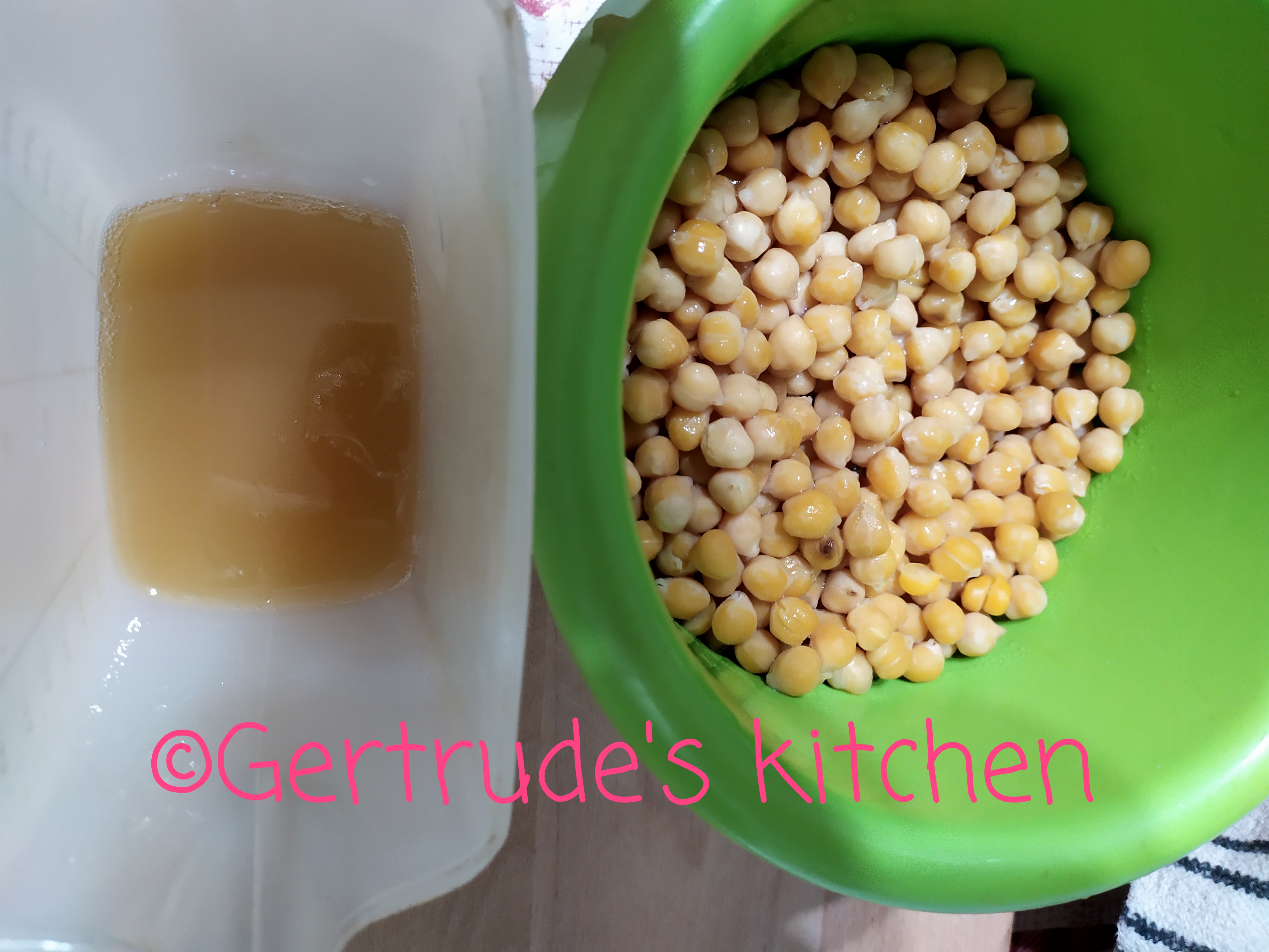 Se strecoară năutul fiert și se măsoară 200 ml din lichidul rezultat. Acesta se pune în vasul mixerului împreună cu sarea și se mixează bine.