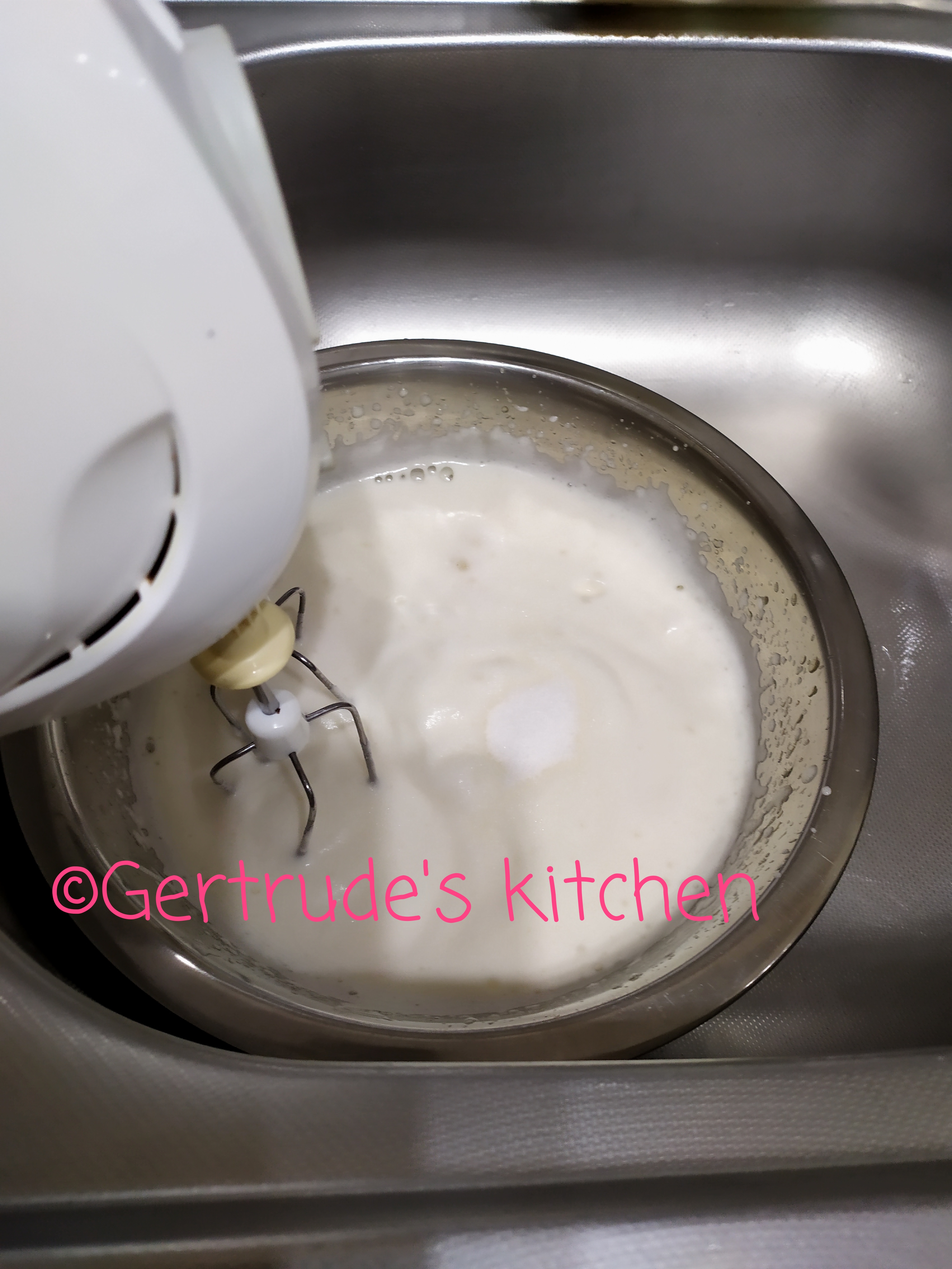 Se amesteca zahărul cu zahărul vanilat și amidonul. Când devine asemenea unei spume albe ( ca și la cea de albușuri) se începe adăugarea treptată a amestecului de zahar- amidon, până ce acesta este incorporat în întregime. Se continuă mixarea până la dizolvarea completă a zahărului și formarea bezelei lucioase. ( cam 15 min)