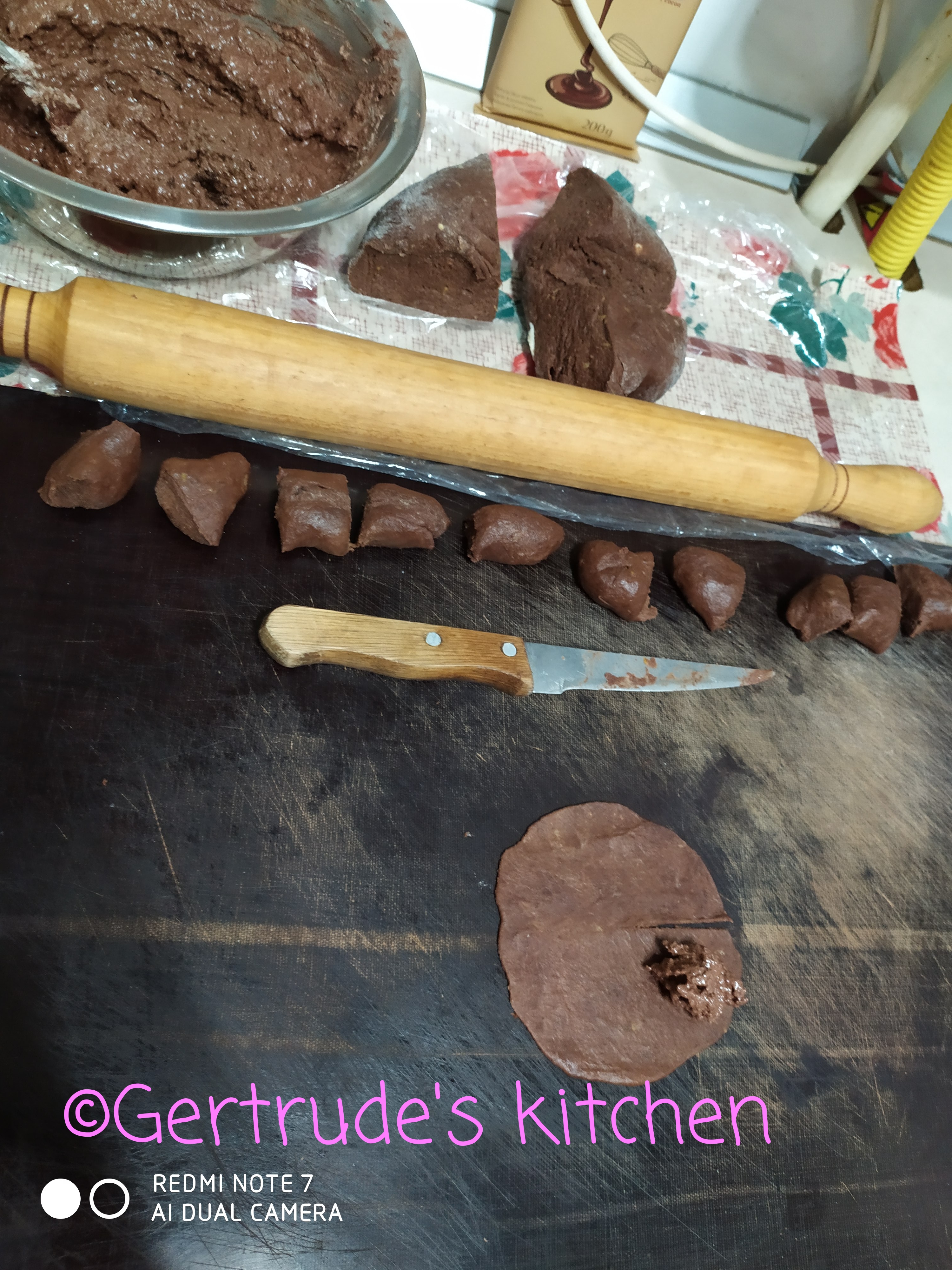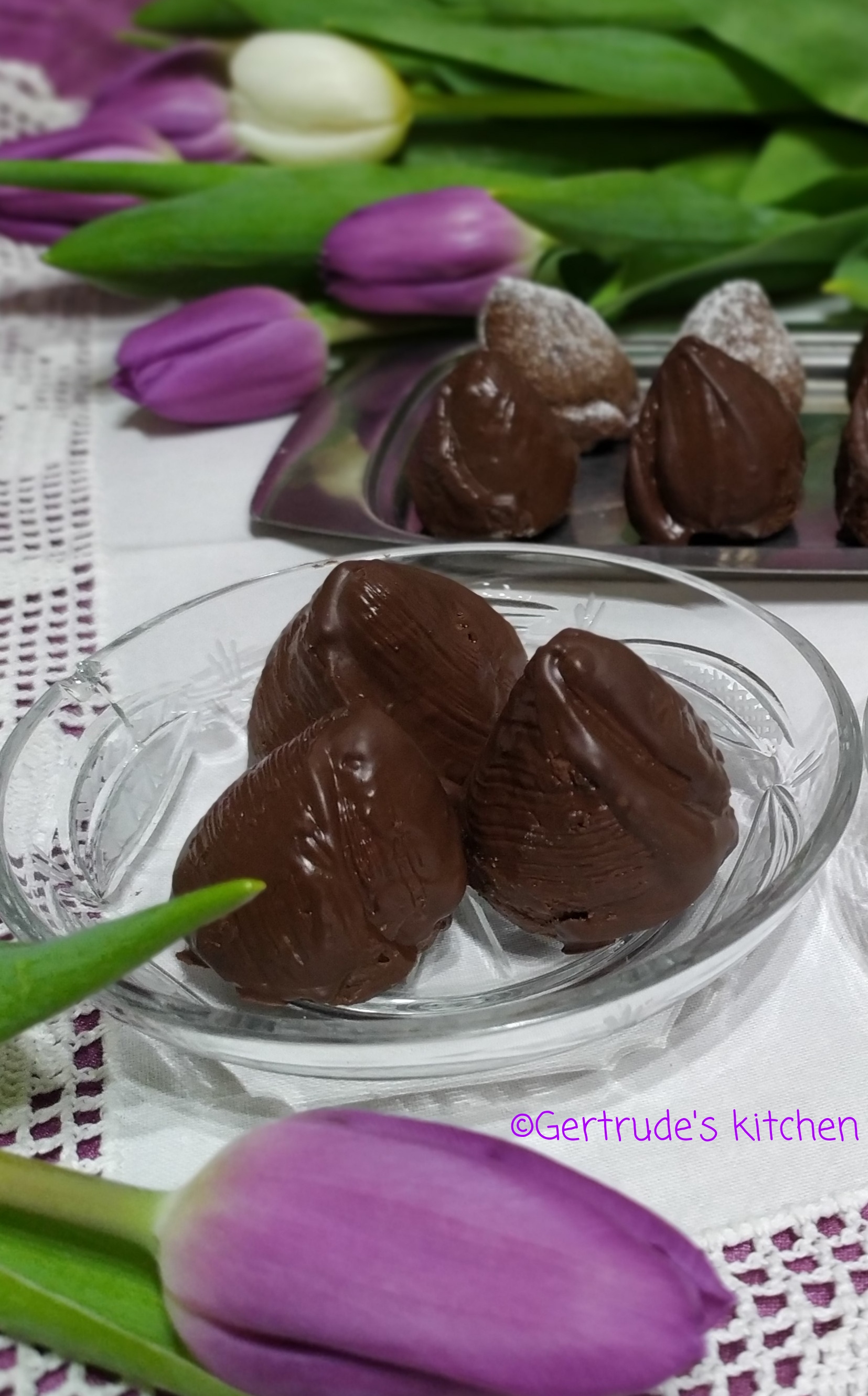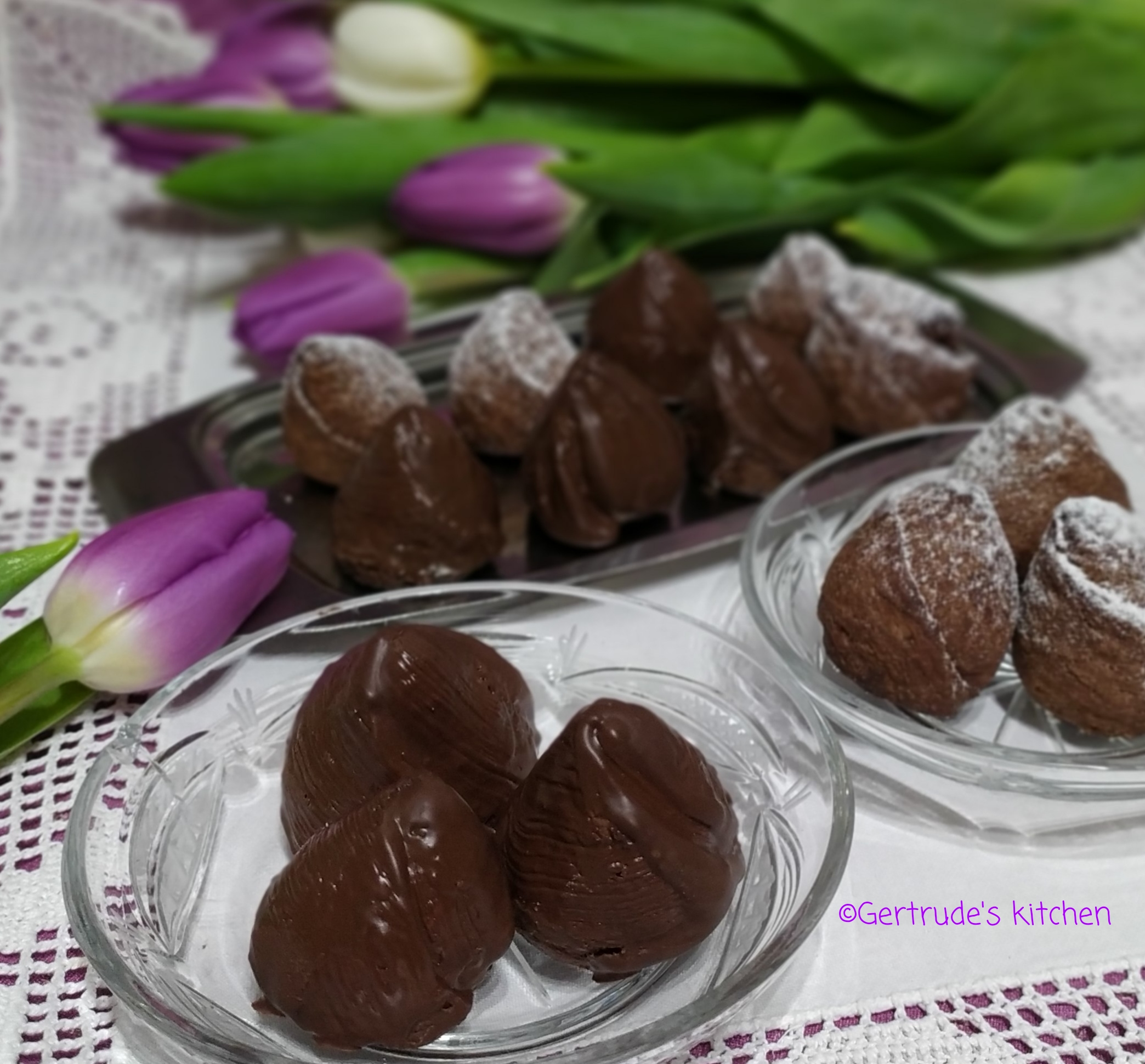 Apoi se scot, se lasă la răcit și se trec plin glazură de ciocolată topită, sau se pudrează cu zahăr. Se așează din nou pe tavă și se lasă că să se întărească ciocolata.