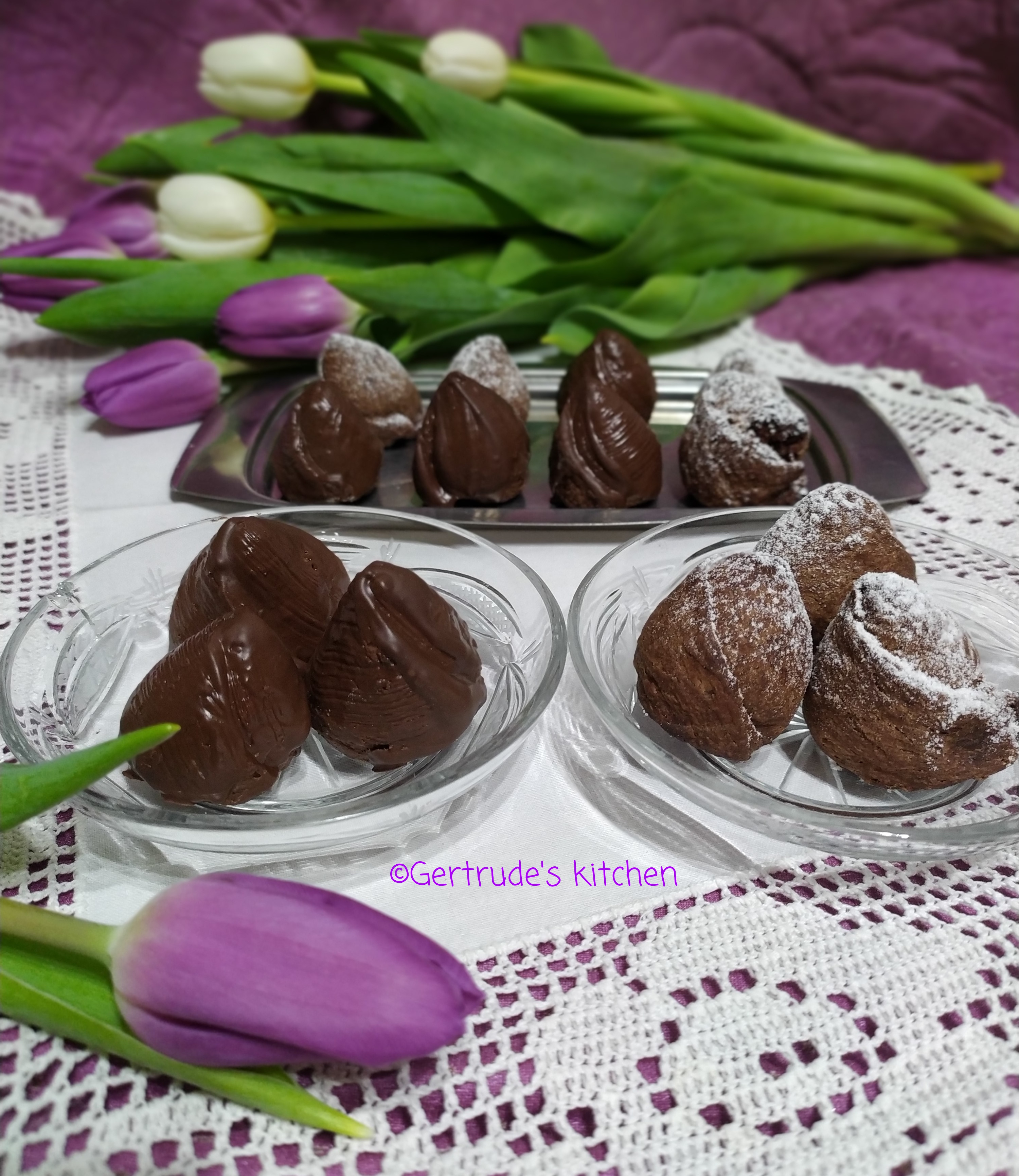 Următoarea rețetă prezintă o astfel de combinație, în care aluatul fraged cu cacao îmbracă un conținut foarte fin cu migdale, bezea și cacao,glazurate apoi cu ciocolată,sau pudrate cu zahăr.Aceasta rețeta(pornită de la alte exemple de rețete asemanatoare, dar care nu au cacao în compoziție și nici nu primesc acesta formă nouă de modelare) este o creație personală. De aceea mi-am permis sa le dau și o denumire personalizată : „LALEAUA NEAGRĂ”