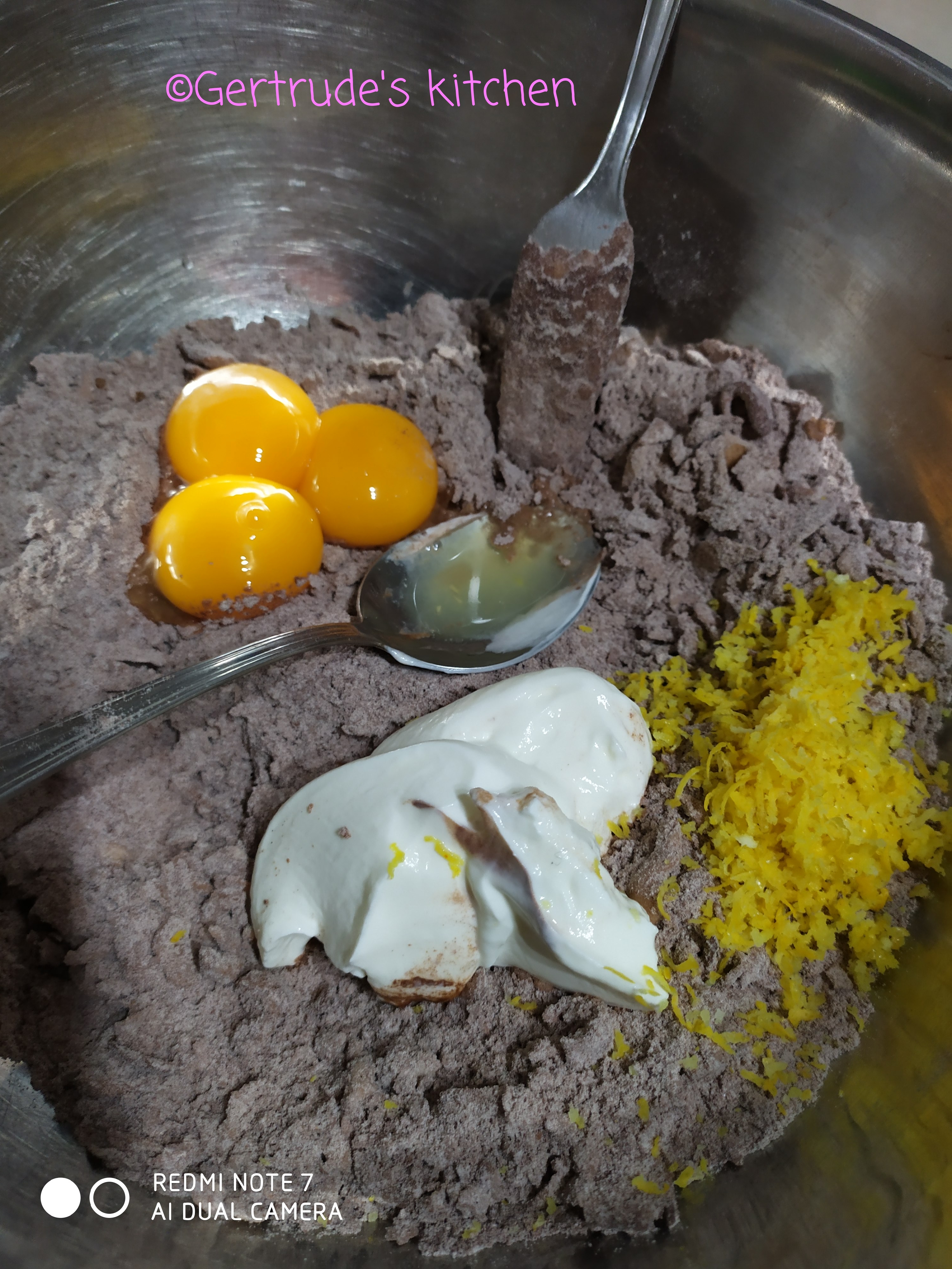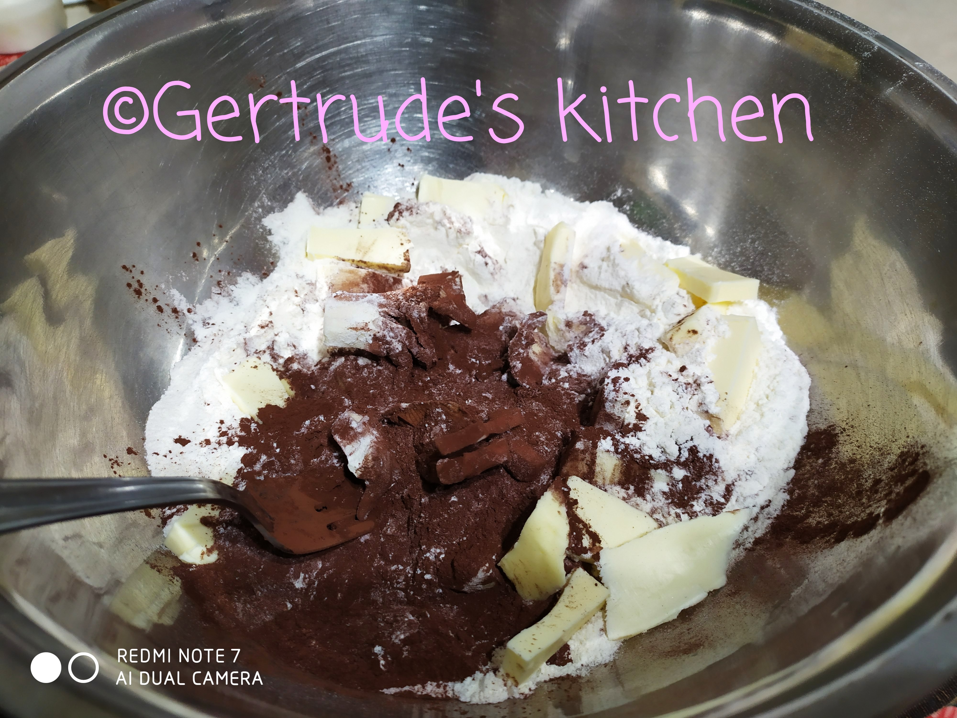 Se pune într-un vas făina cernută, cacaoa sarea și zahărul vanilat. Apoi se adaugă untul rece tăiat bucățele. Se amestecă cu o furculiță până totul devine o masă nisipoasă. Se adaugă iaurtul si gălbenușurile și se amestecă mai departe cu furculița.E necesar ca masa să aibă cât mai puțin contact cu mâinile pentru a nu se încălzi. În final se frământă foarte puțin, doar atât cât să devină un aluat omogen. Apoi se învelește in folie alimentară și se dă la frigider pentru cel puțin o jumătate de oră.