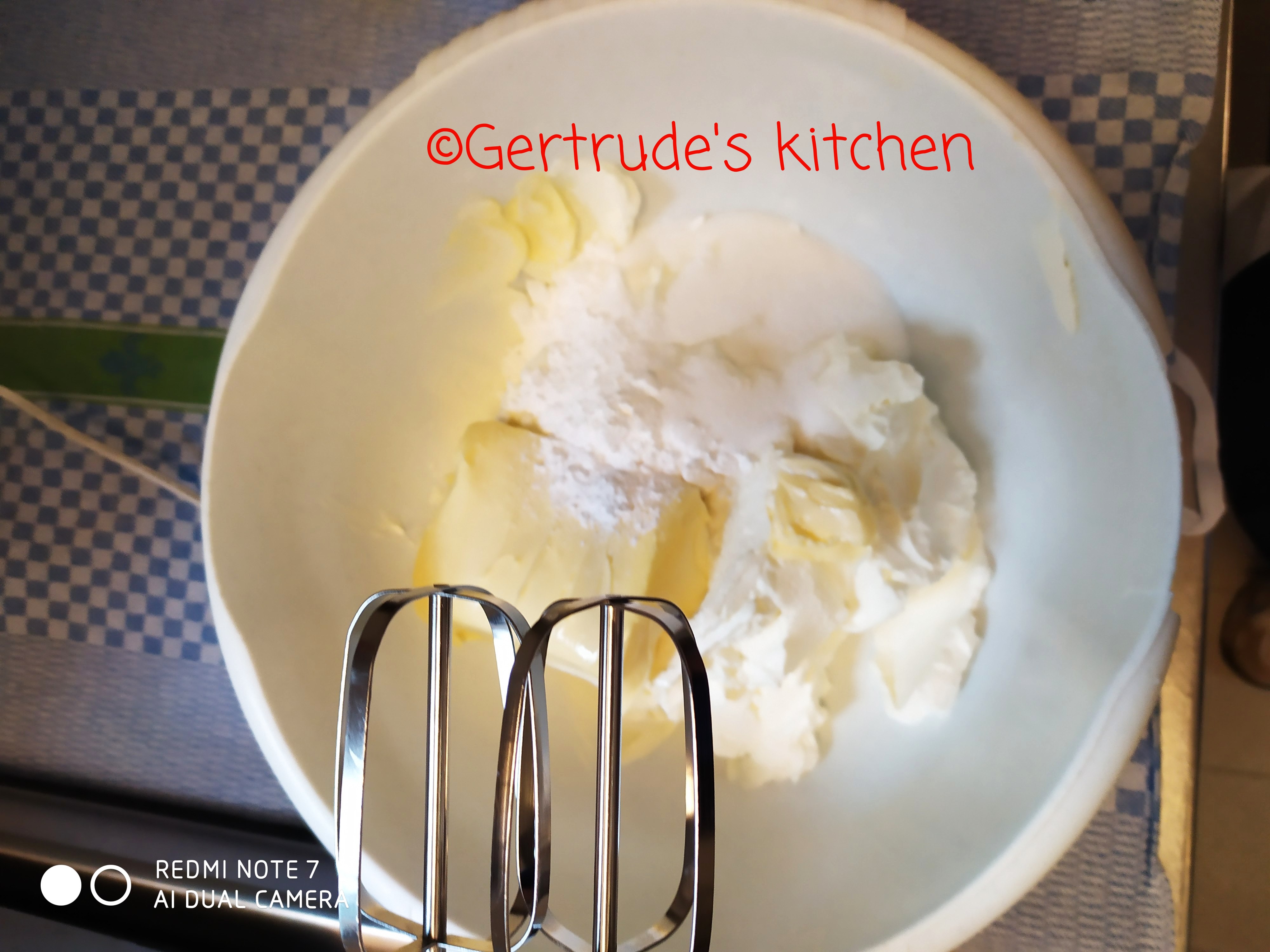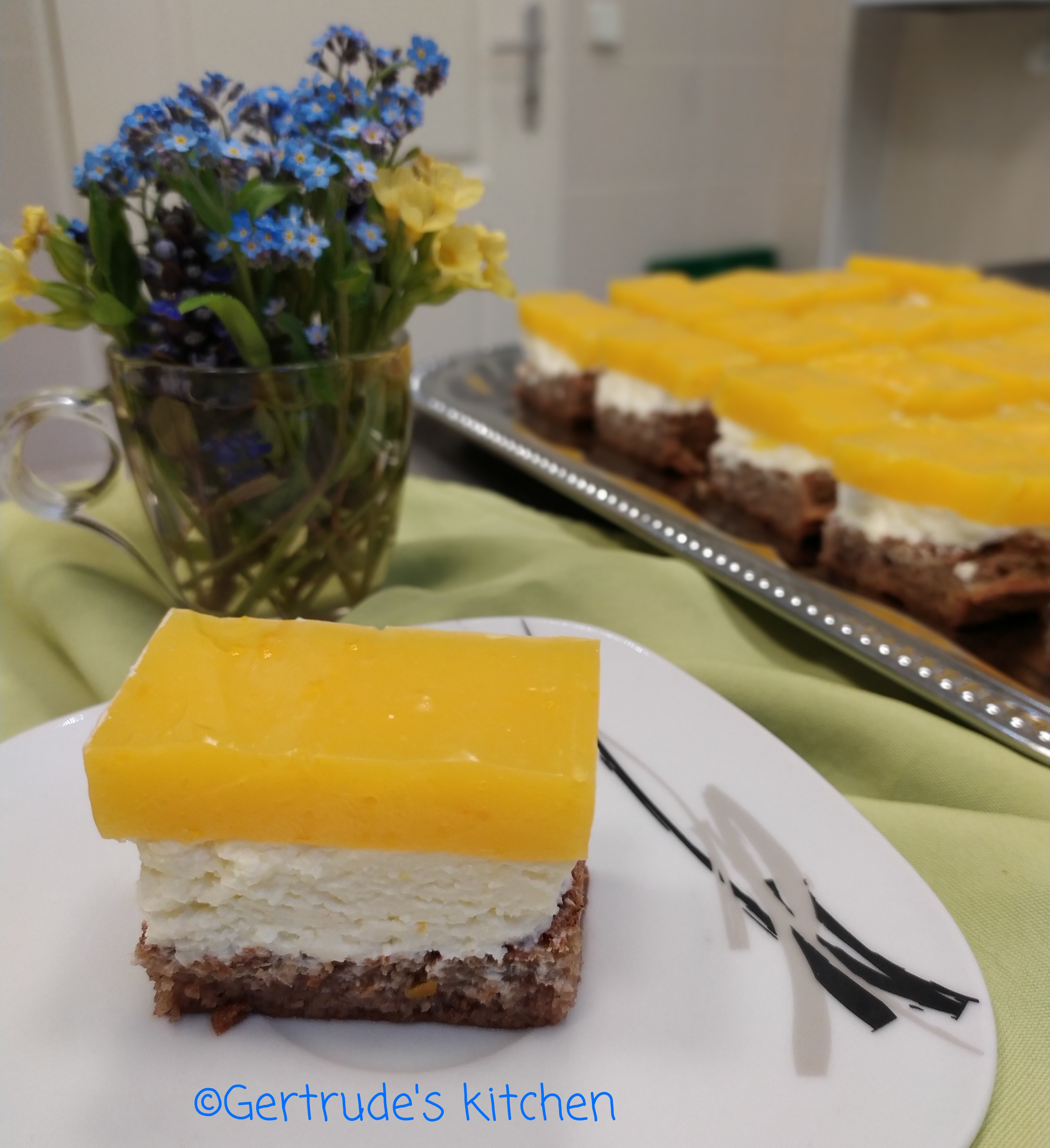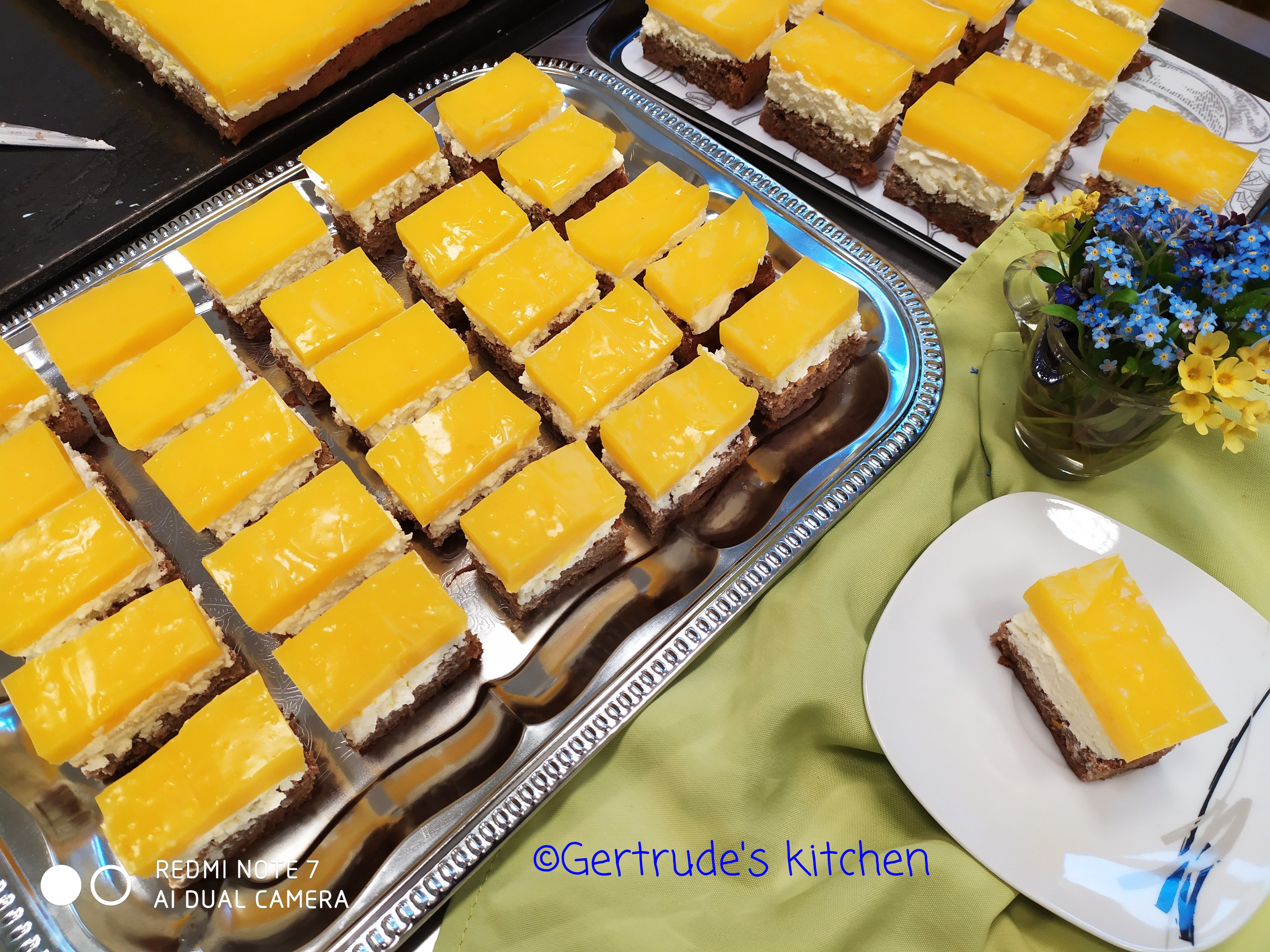 Într-un bol se pun brânza, untul, zahărul și zahărul vanilat și se mixează bine până devine o cremă pufoasă. Aceasta se întinde peste blatul insiropart. Se dă la frigider până se prepară gelatina.