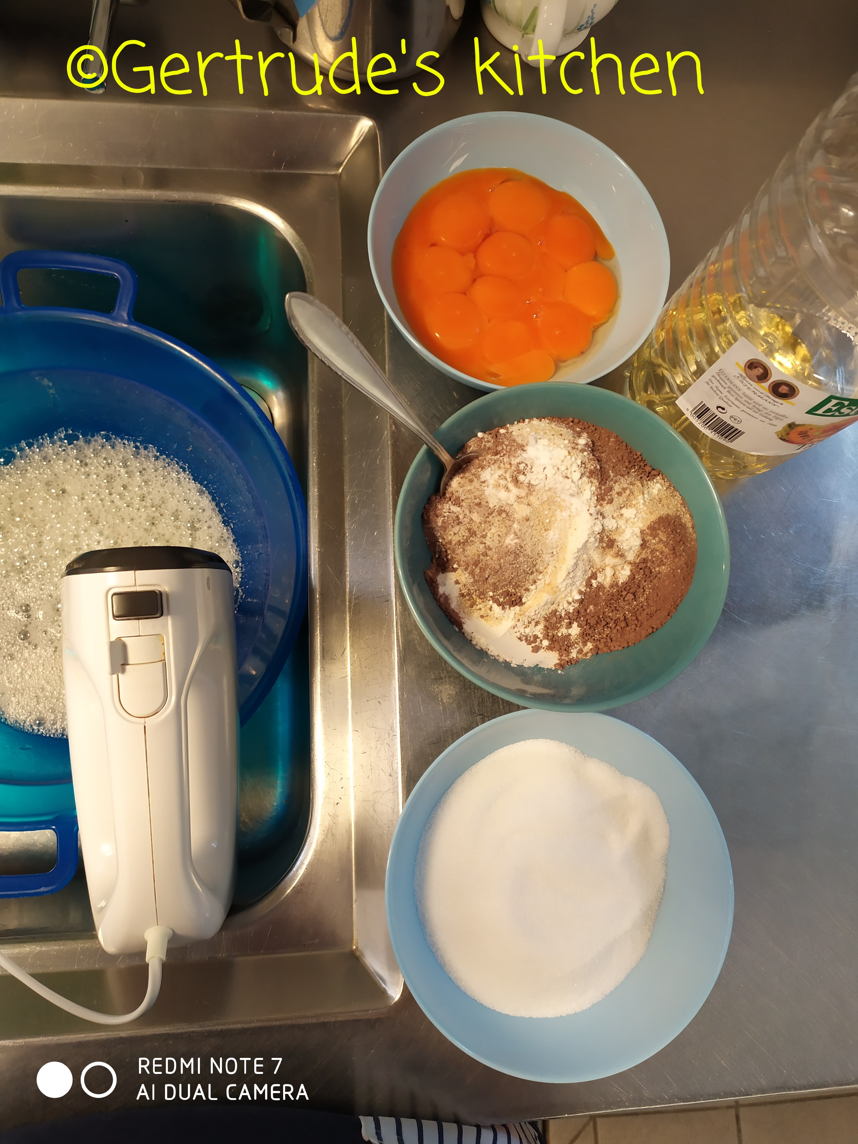 Se adaugă făina, pesmetul, cacaua și praful de copt. Se amestecă cu o spatulă, ușor, prin răsturnare.