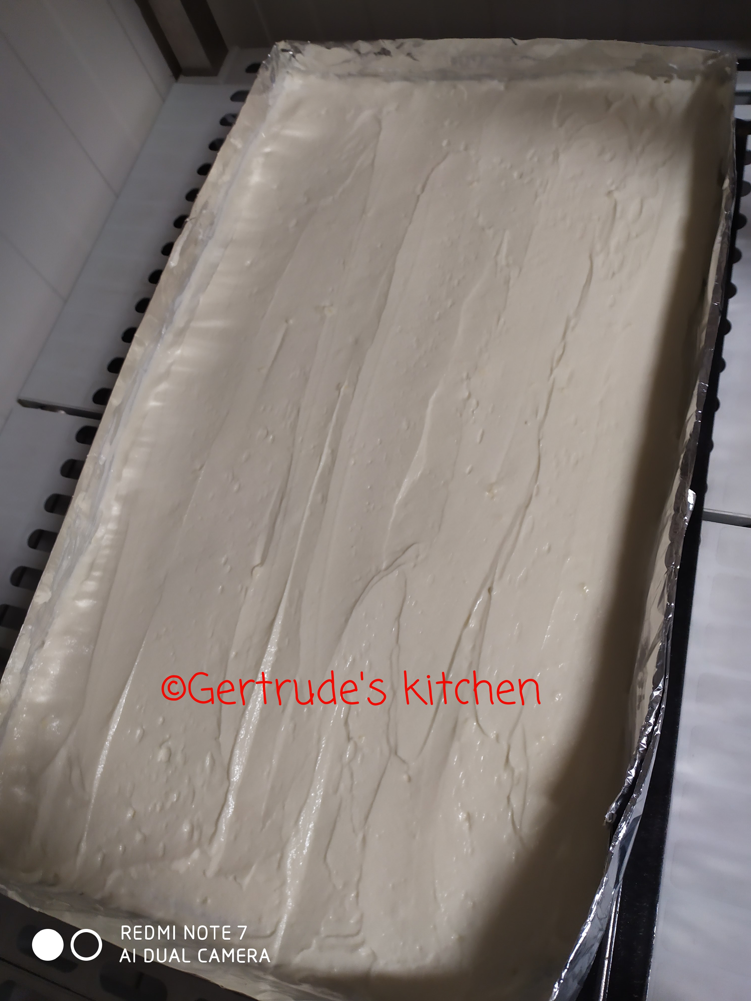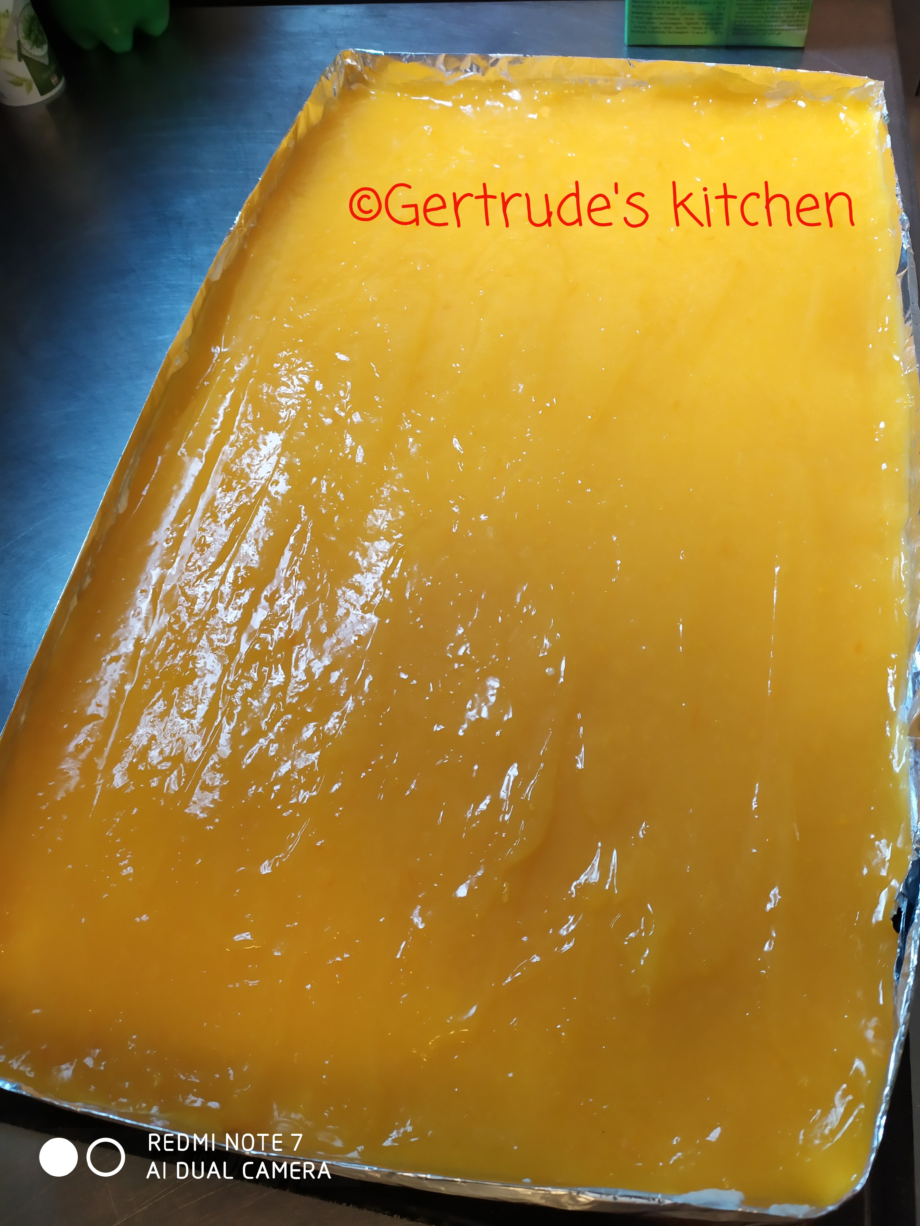 Când este încă fluidă, se toarnă peste cremă și se întinde într-un strat uniform.