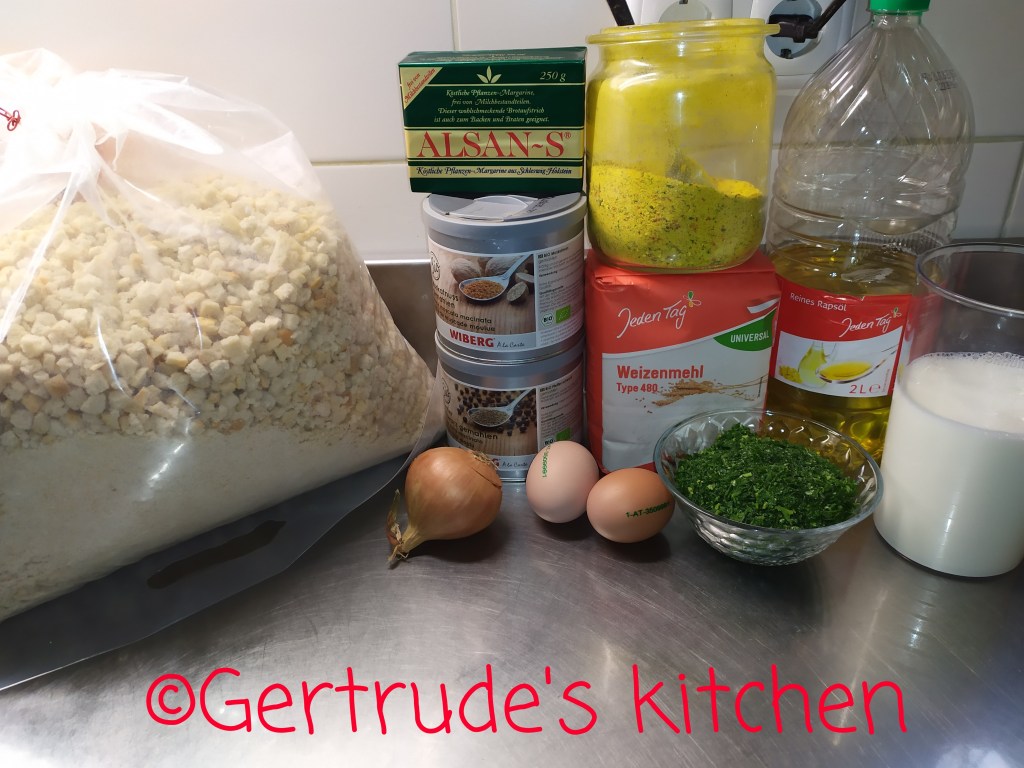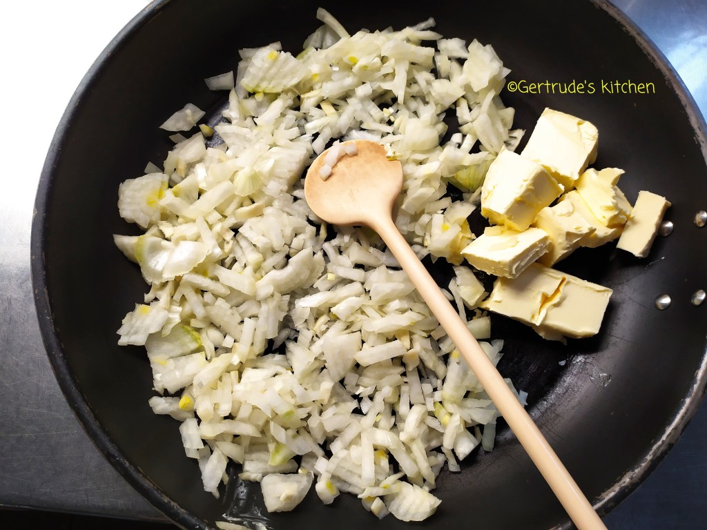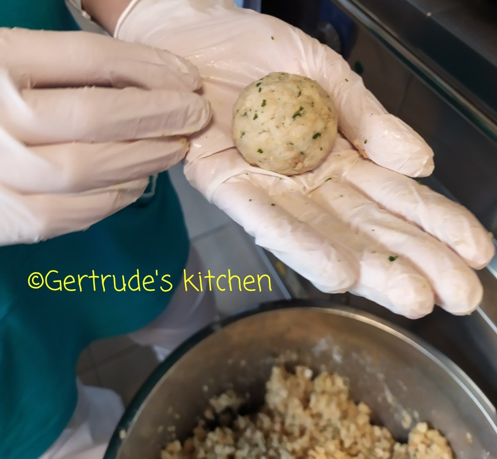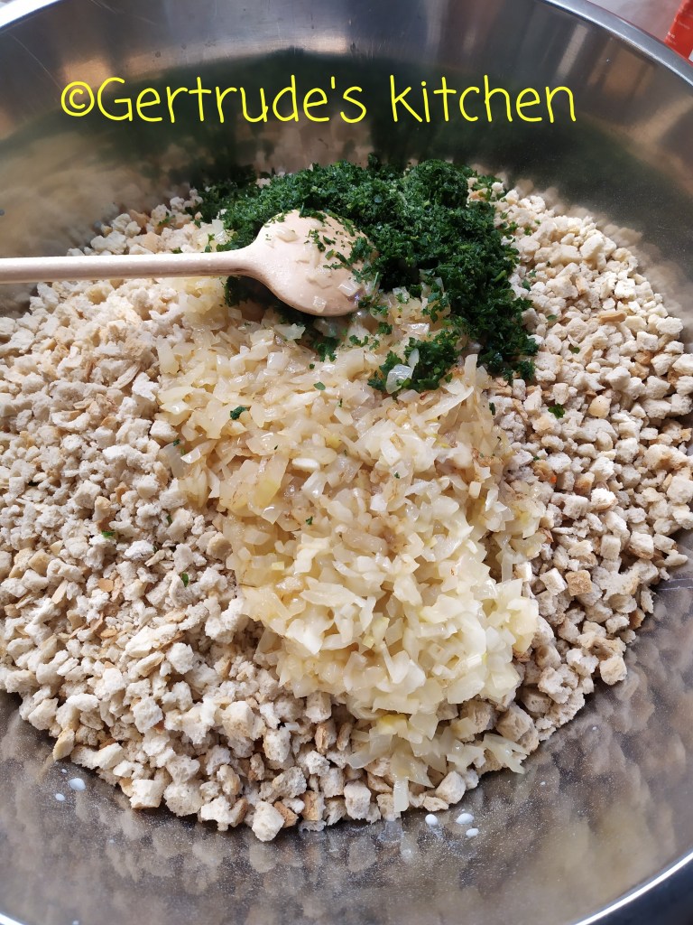 Separat se călește in unt ceapă tocată. Apoi se adaugă peste pâinea înmuiată. Se adaugă și făina, ouălele și pătrunjelul tocat. Se amestecă bine toate laolaltă ca un aluat grunjos.