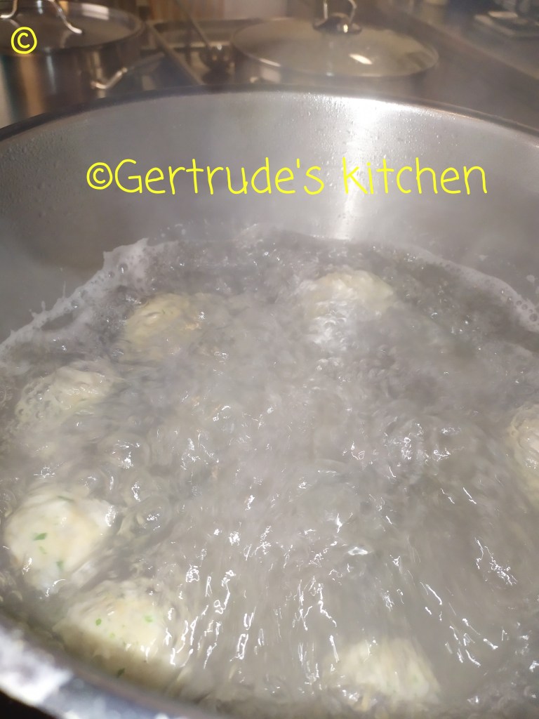 Când apa incepe sa fiarbă, cu mâinile umede se formează biluțe, de mărimea unui ou mic, din aluatul format anterior, și se pun la fiert în apa cu sare. Se fierb 20 de minute până ce se ridică la suprafață. Apoi se scot cu o paletă sau spumieră într-o tavă sau un castron.