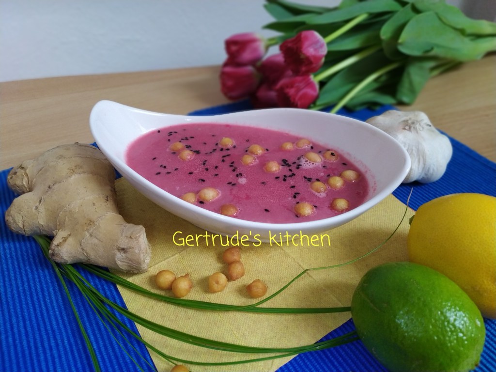 Supa de sfeclă roșie cu nucă de cocos poate fi servită ca aperitiv sau ca fel principal.