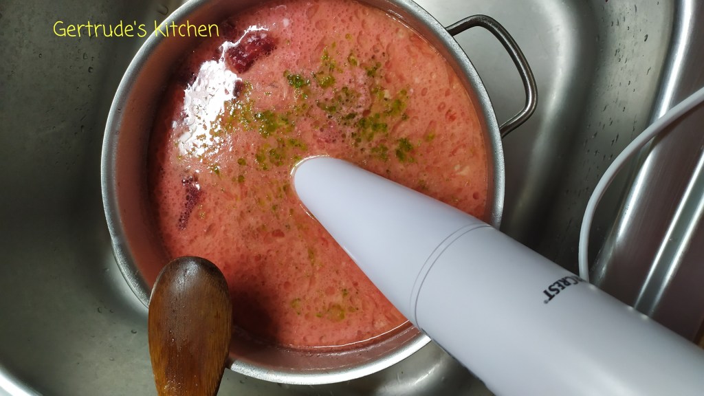 Acum se poate retrage supa de pe foc și se blendează totul bine cu un blender de mână până când supa devine fină și cremoasă.
